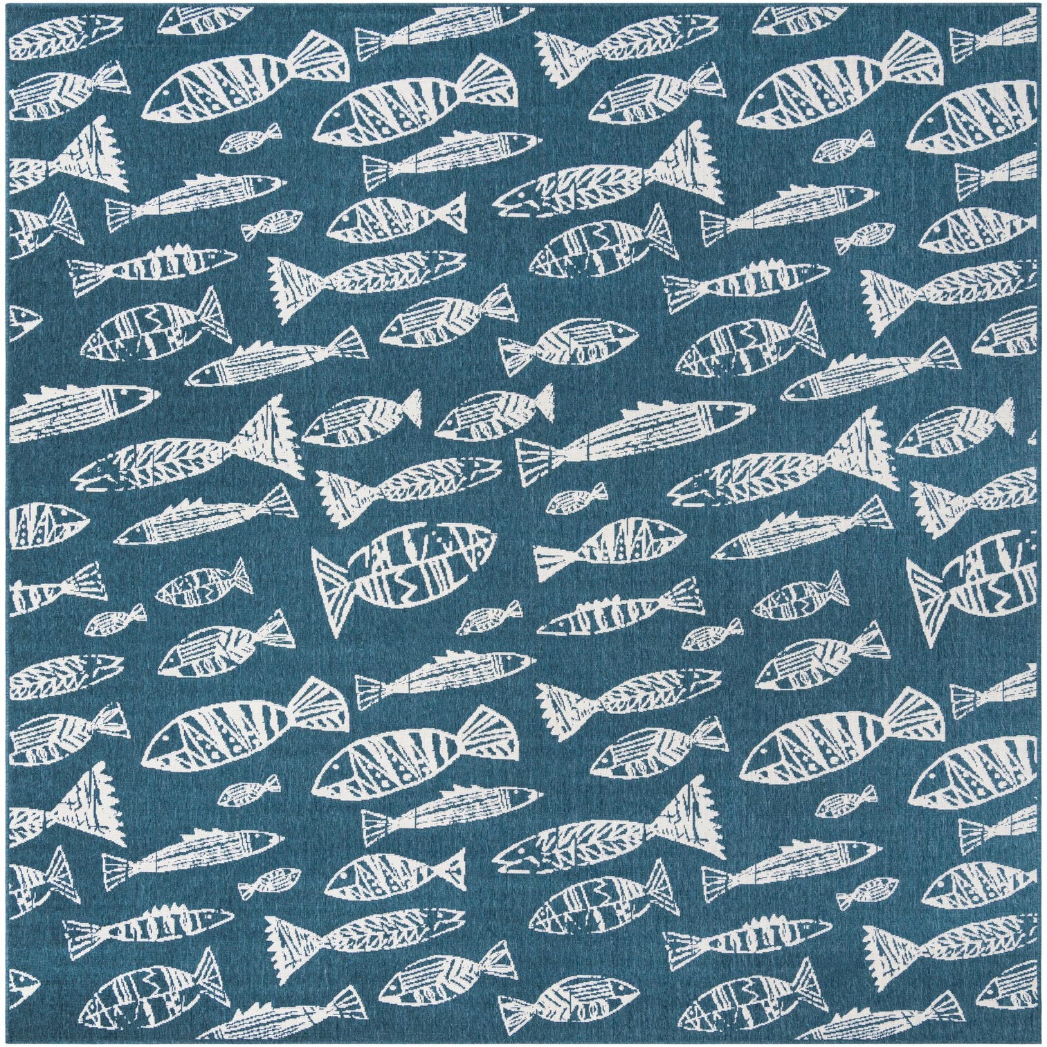 A 9x12 rectangular indoor/outdoor rug featuring a playful pattern of white fish on a textured blue background.