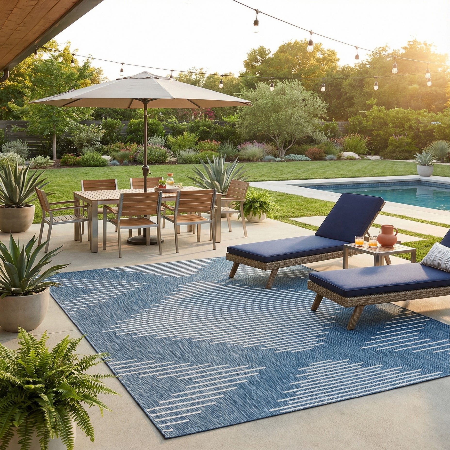 Given its pet-friendly and shed-free nature, this rug is particularly suitable for homes with pets, as it stands up well to wear and demands minimal upkeep. Its crisp design and cool color palette make it compatible with a variety of decor styles, especially spaces that embrace modern, minimalistic, or coastal themes. The rug's robust construction and pattern can effortlessly anchor a patio seating area, an open-plan living space, or a dining room setting, complementing both neutral and bolder color schemes.