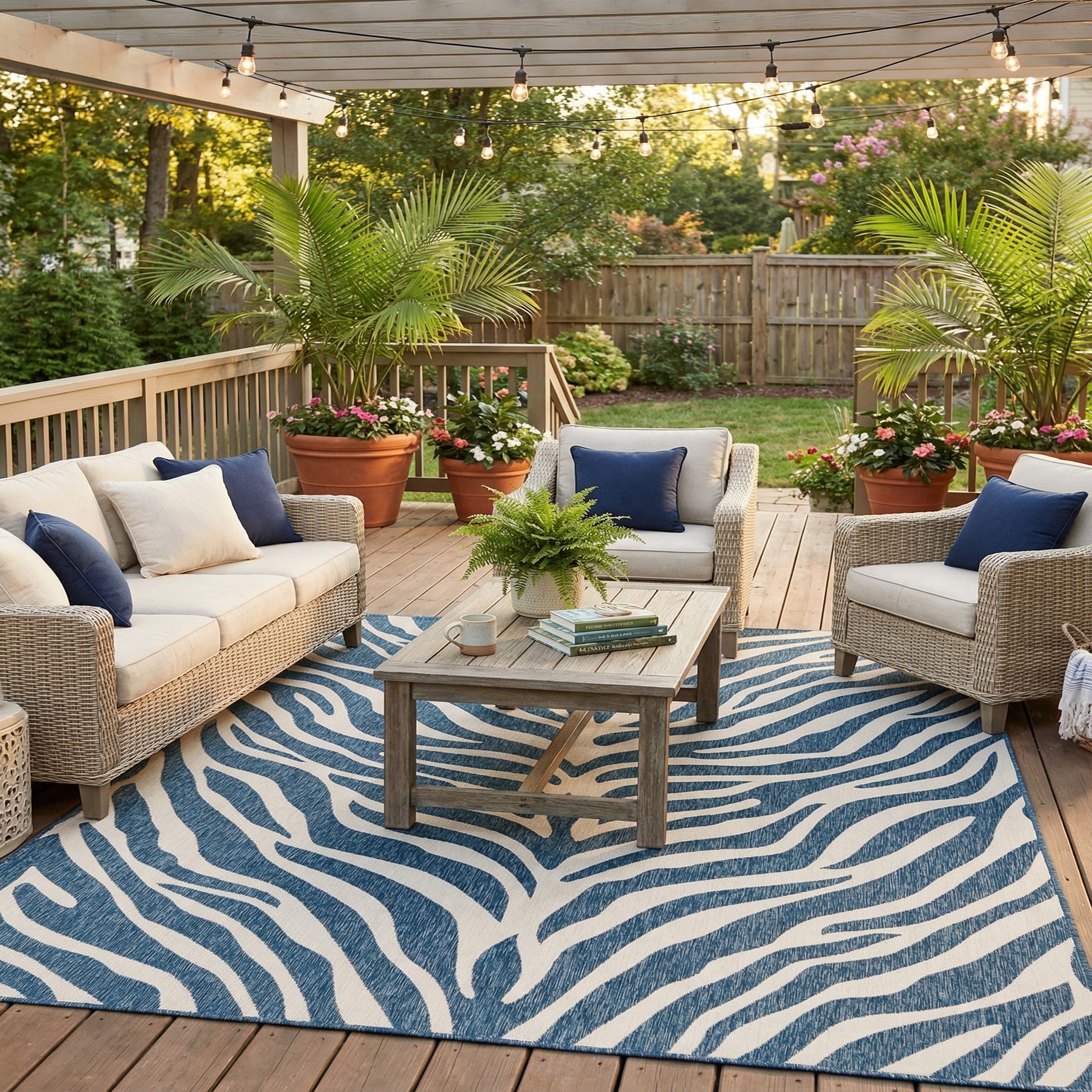 A 9x12 rectangular indoor/outdoor rug featuring a modern blue and white zebra stripe pattern, ideal for a patio or living room.