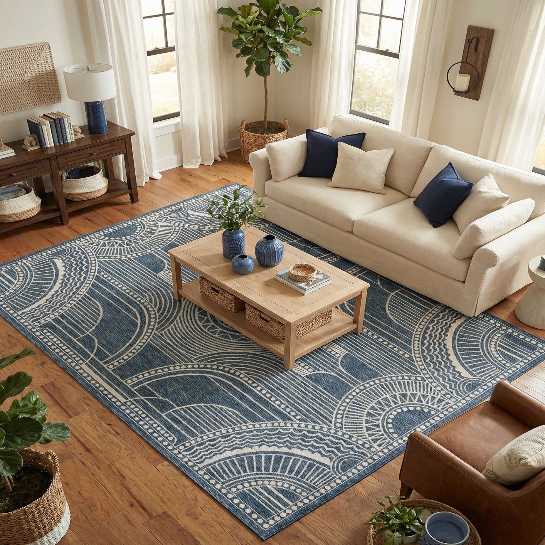 This rug works well as an anchor for a covered patio, sunroom or casual dining area, and it pairs naturally with light woods, wicker or navy upholstery. Use it to bring a structured, architectural touch to coastal, transitional or modern-traditional interiors, or to add pattern beneath a seating group or dining table for a pulled-together look.