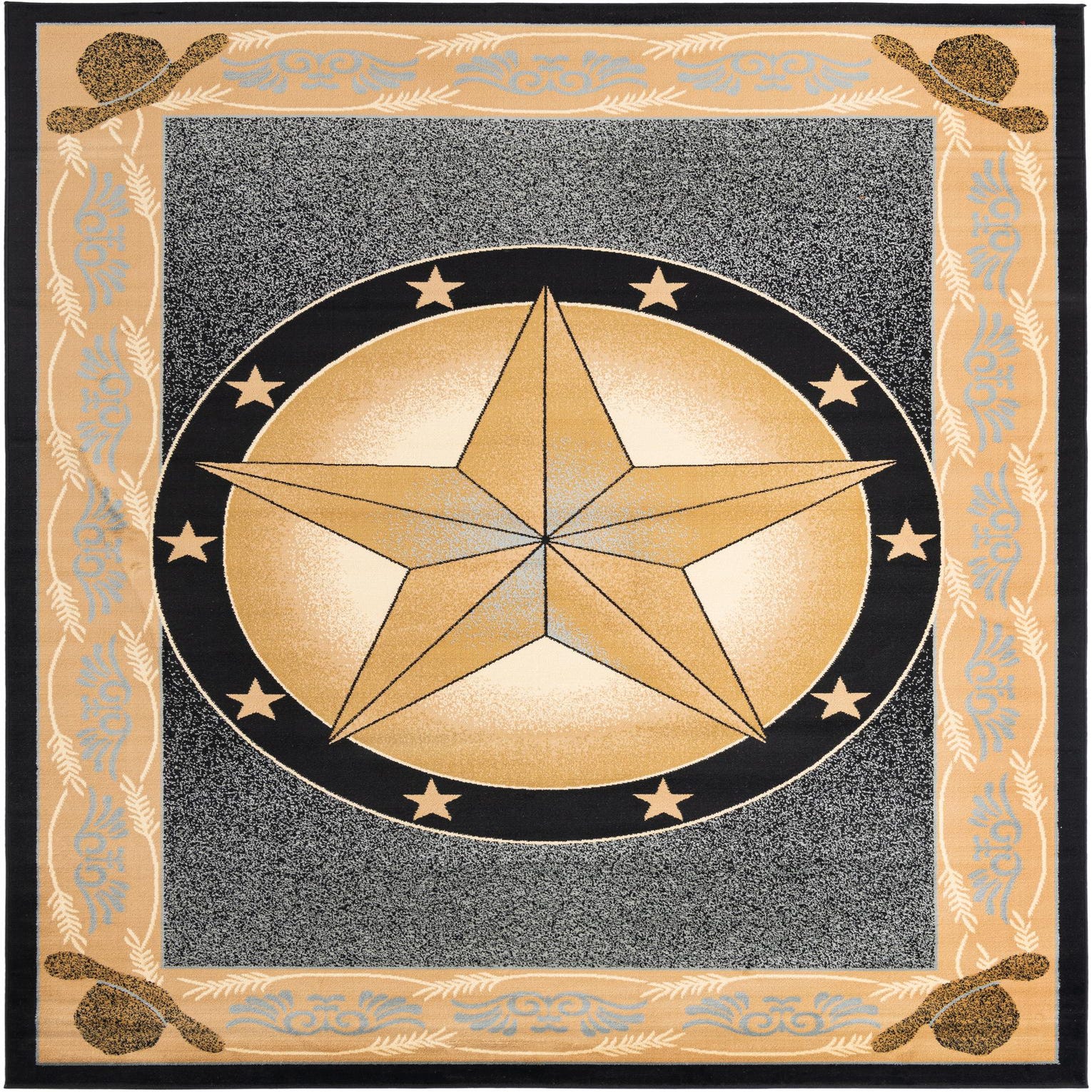 A bold five-point star sits at the center of this machine-made rug, rendered in warm beige and brown tones that contrast against a blue background with subtle gray speckling. A black circular band, dotted with smaller stars in ivory, frames the medallion and anchors the composition. The outer beige border carries scrollwork and wheat-like motifs in ivory and light blue, with small brown hat accents in the corners, giving the overall design a collected, Americana-inspired feel. Colors include blue, beige, black, brown, ivory, and gray, and the tight polypropylene construction keeps each motif sharply defined.