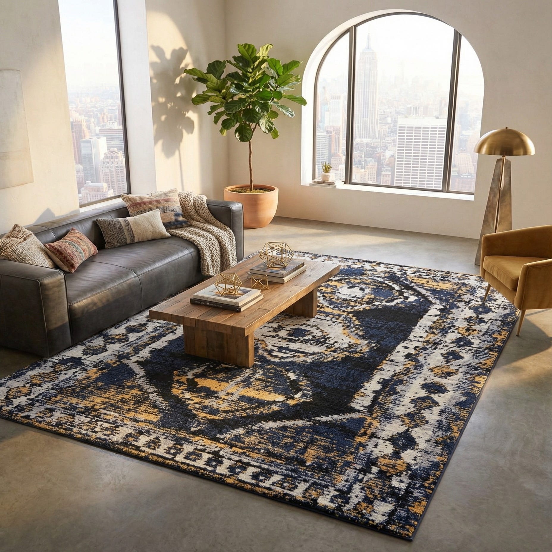 A rich blue field anchors a bold medallion layout, where elongated geometric motifs float against a painterly, distressed background. Navy and black define the central shapes while ivory and gray add contrast and definition; touches of yellow warm the composition and bring a subtle, lived-in energy. The pattern balances traditional medallion and tribal references with a modern, weathered finish that reads layered and textural.