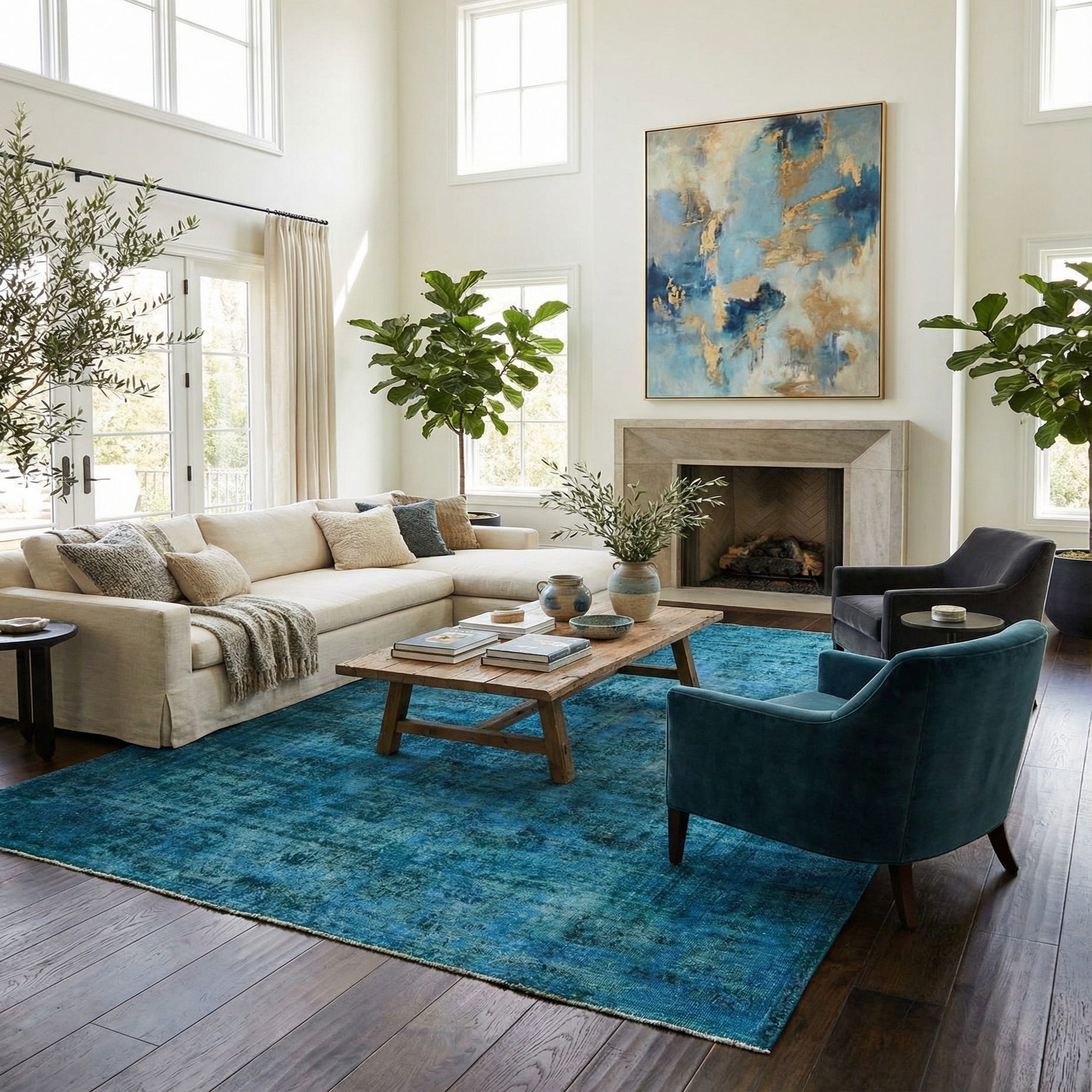 A 9x12 rectangular Ultra Vintage rug by Rugs.com, featuring a distressed Persian pattern in varying shades of blue, ideal for a living room.