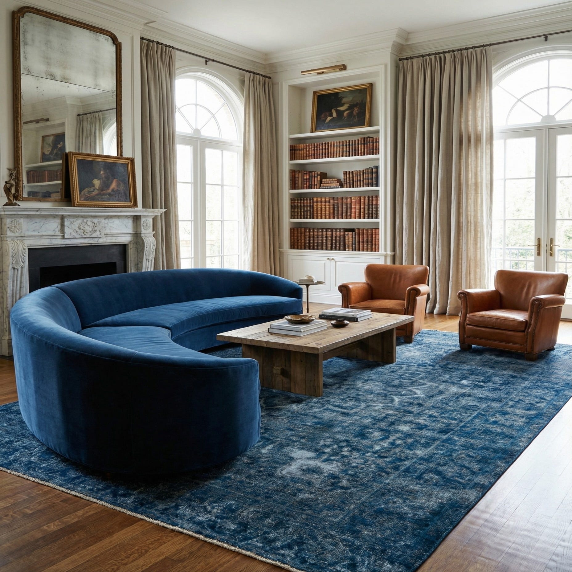 Primary color is Blue. Colors in this rug include: Blue, Light Blue, Navy Blue, Ivory.
