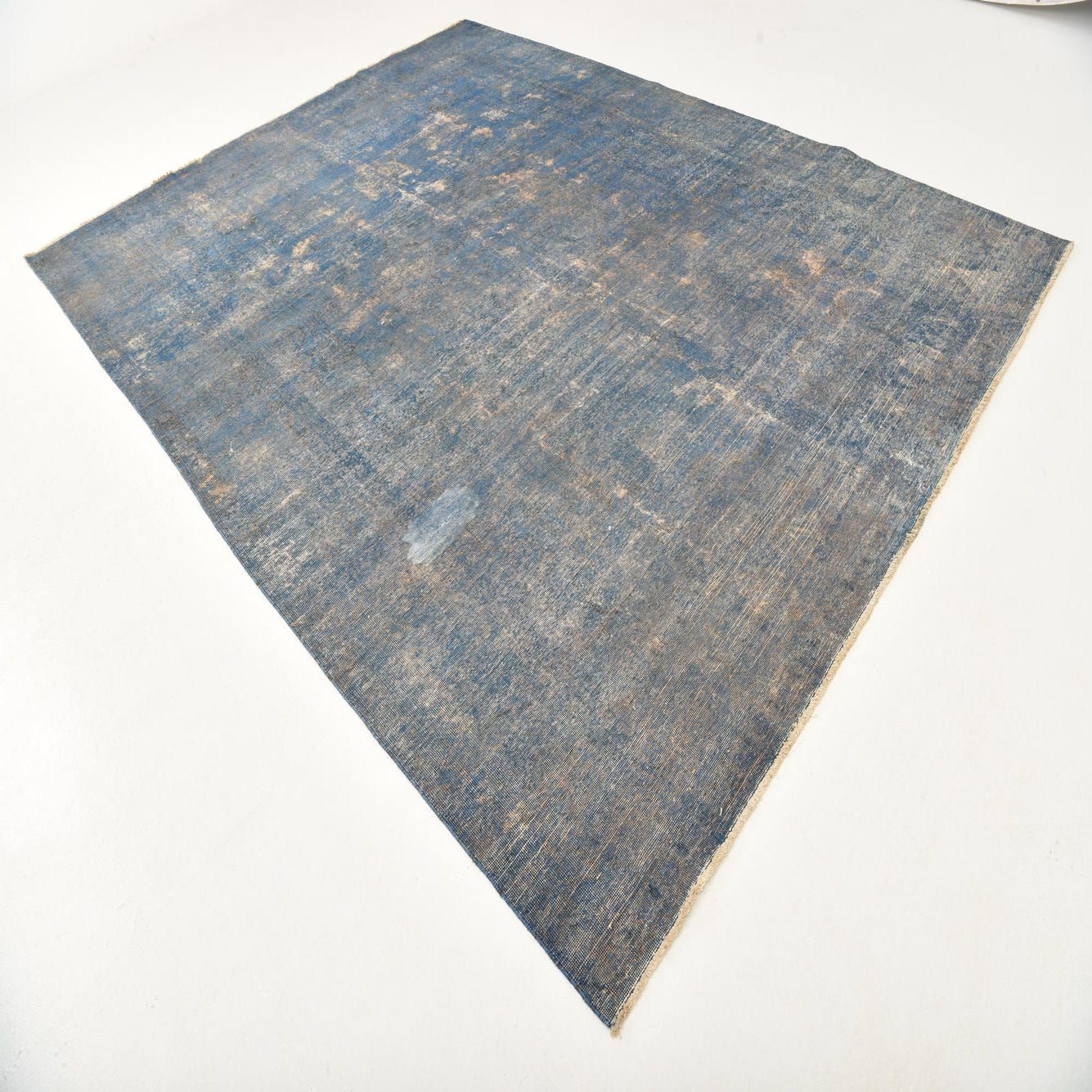 A large 9x12 rectangular Ultra Vintage rug in varying shades of blue with a distressed Persian medallion pattern.