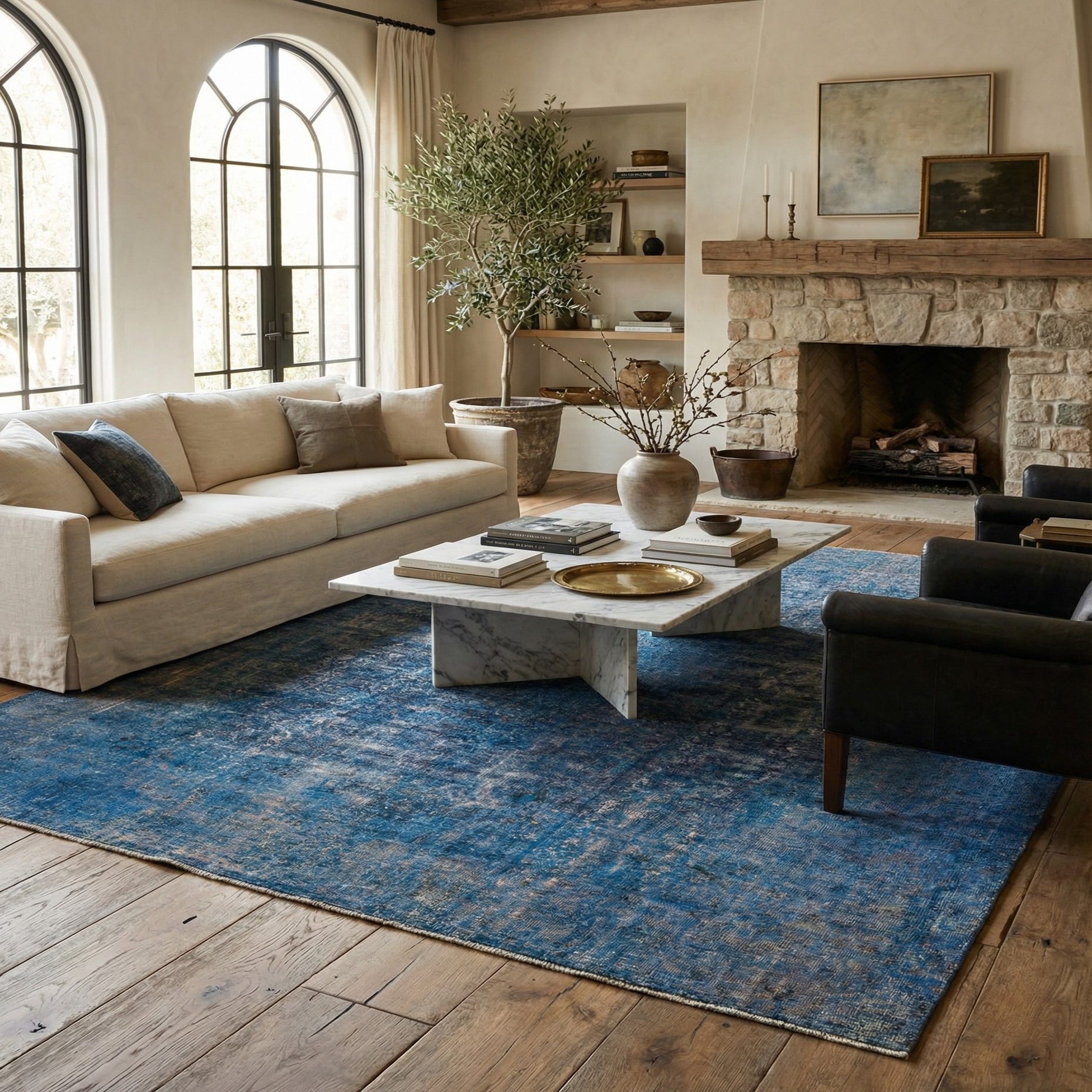 Primary color is Blue. Colors in this rug include: Blue, Navy Blue, Ivory.