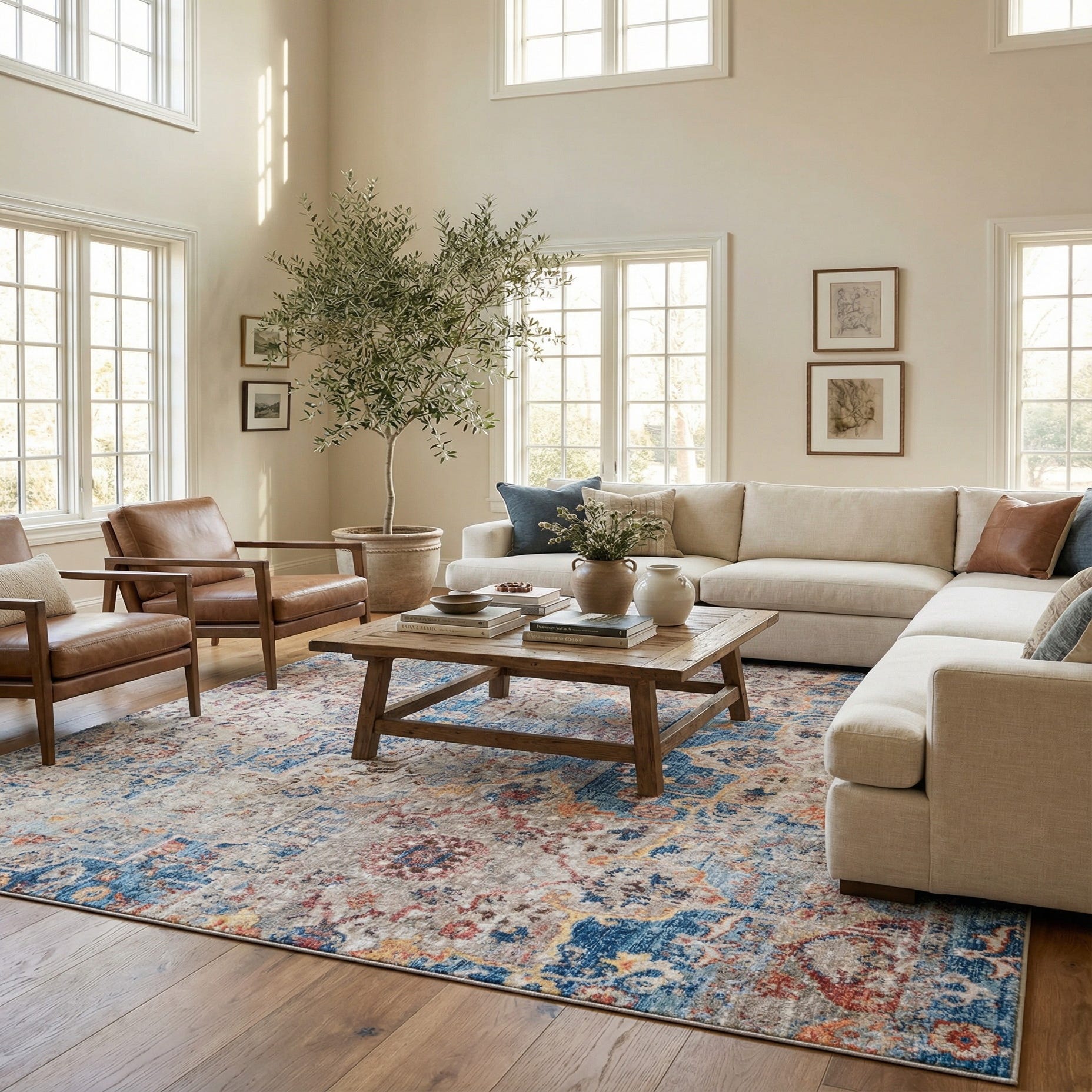Primary color is Blue. Colors in this rug include: Blue, Beige, Brown, Orange, Red, Pink.