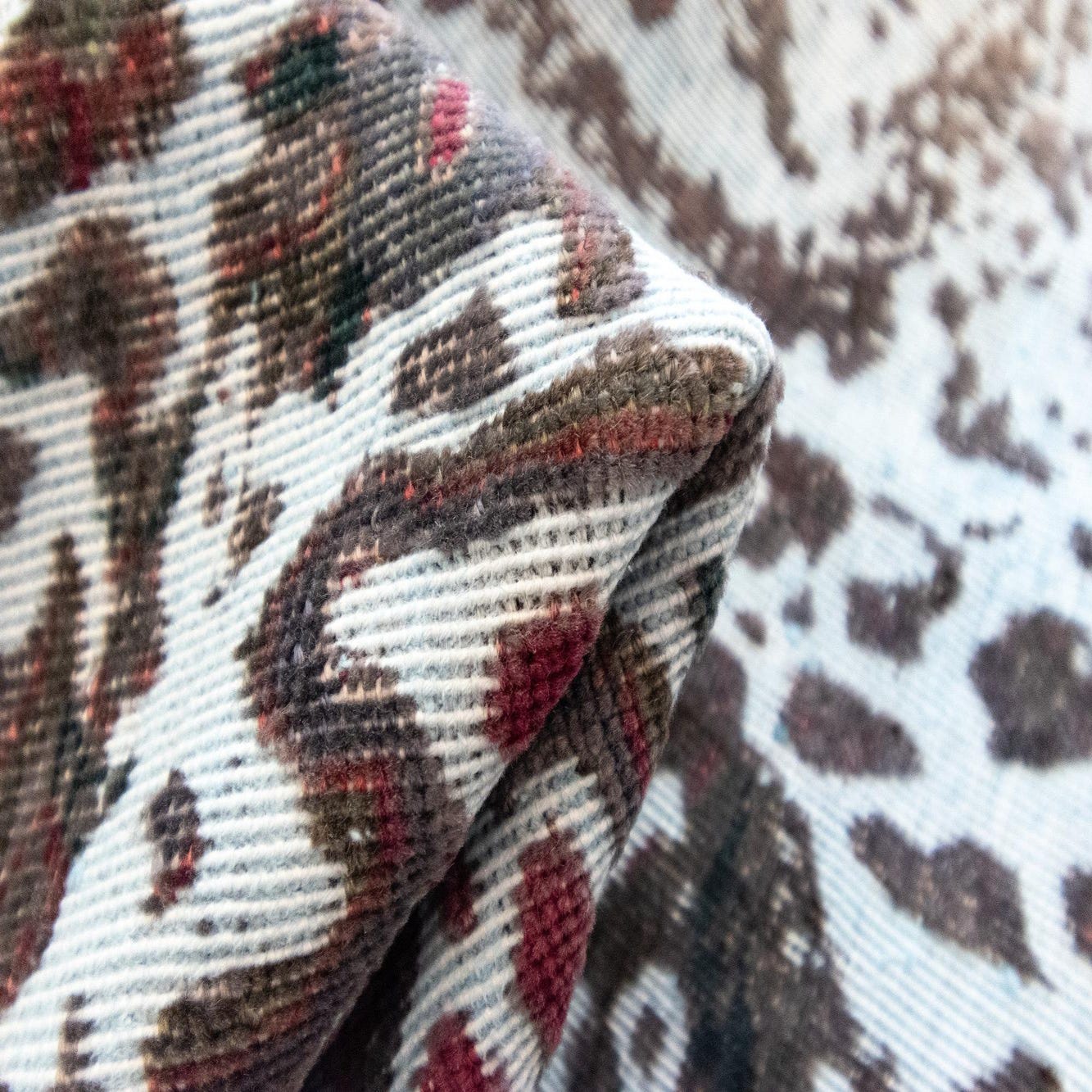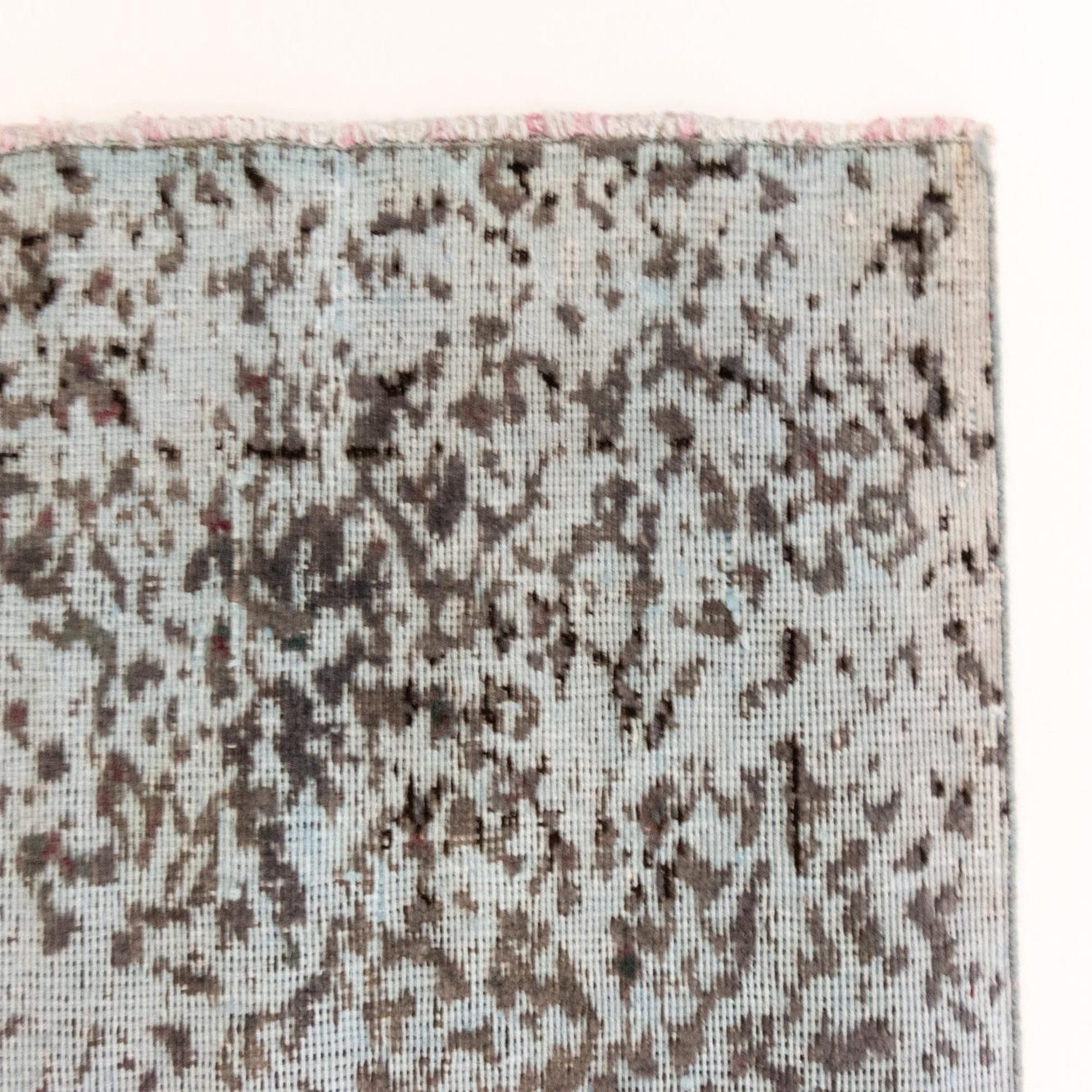 A 9x12 rectangular blue Persian rug with an intentionally distressed, vintage-style pattern in a living room setting.
