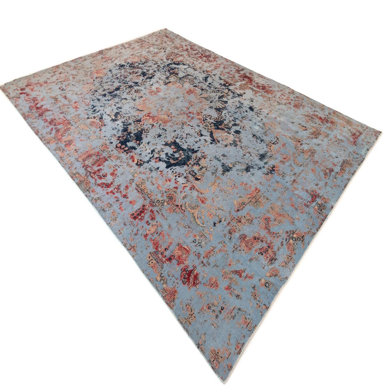 A 9x12 rectangular Rugs.com Vintage Royal Persian rug in shades of blue with distressed red and gold accents, suitable for a living room.