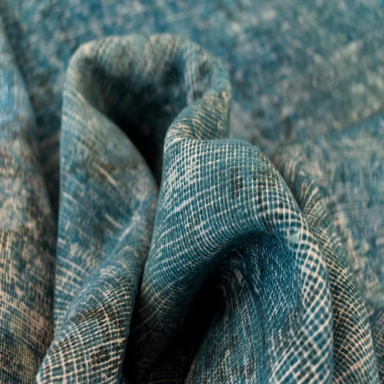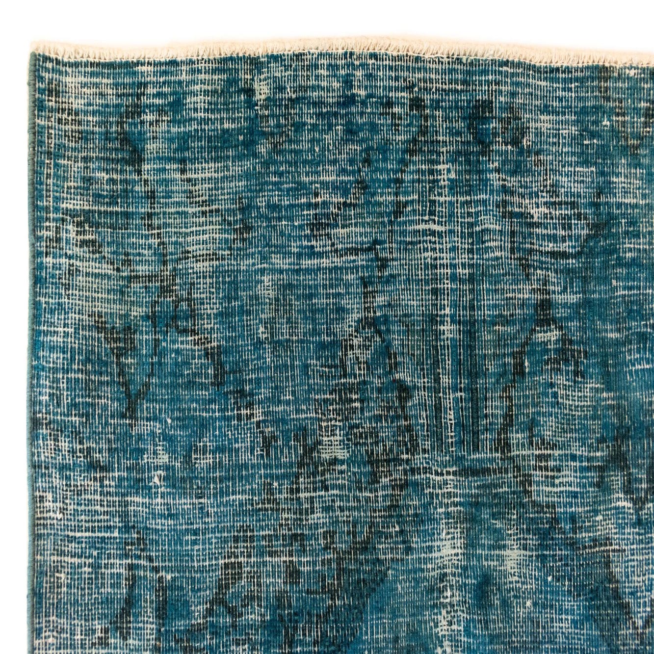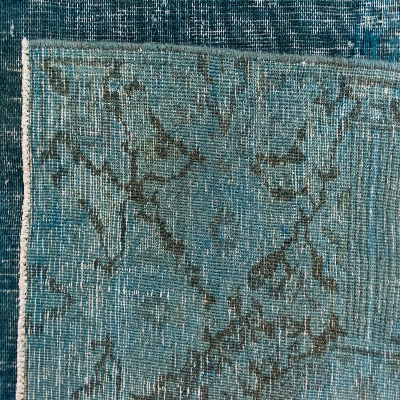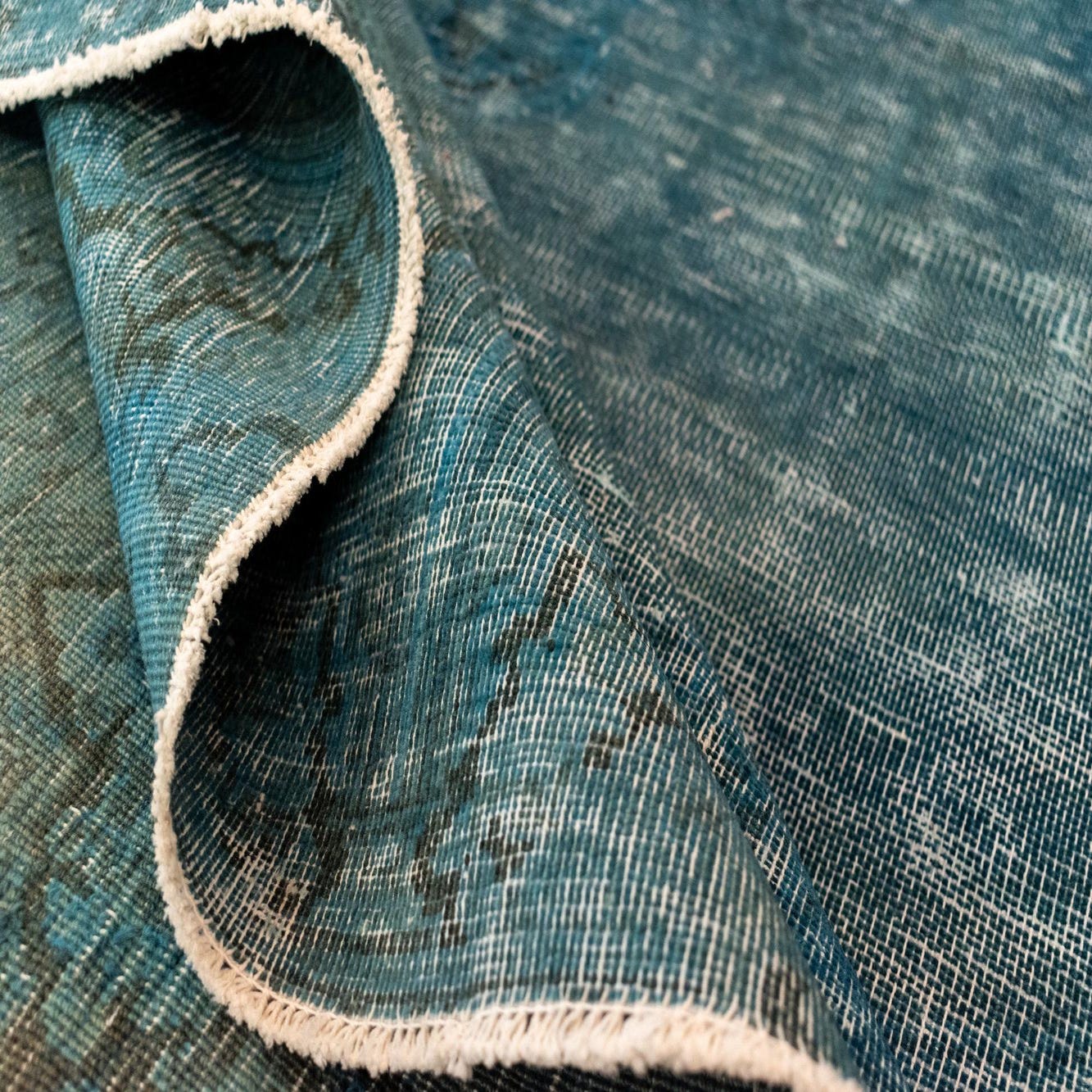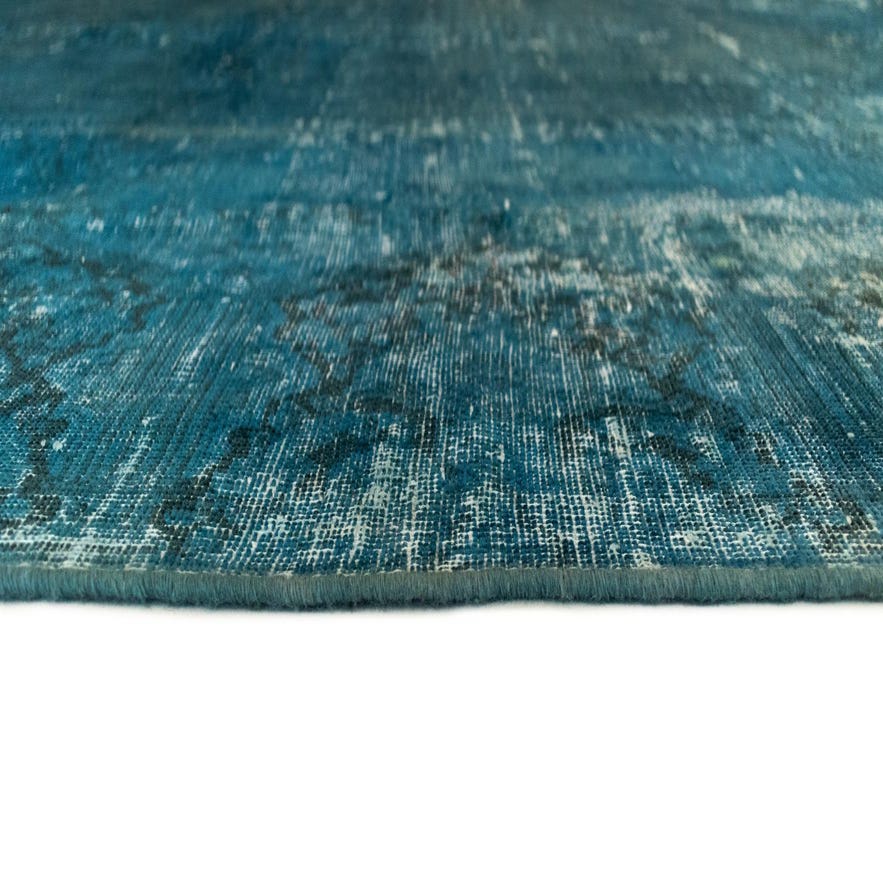 A deep blue ground anchors a softly distressed medallion and an ornate, tone-on-tone border. The pattern is traditional with a vintage-washed finish, where subtle teal and charcoal accents emerge from the pile to highlight the central motif and corner detailing. Hand made of 100% wool, the rug has a low, dense pile with a warm, slightly velvety hand and natural variation from the weaving process that gives the surface gentle depth and character.