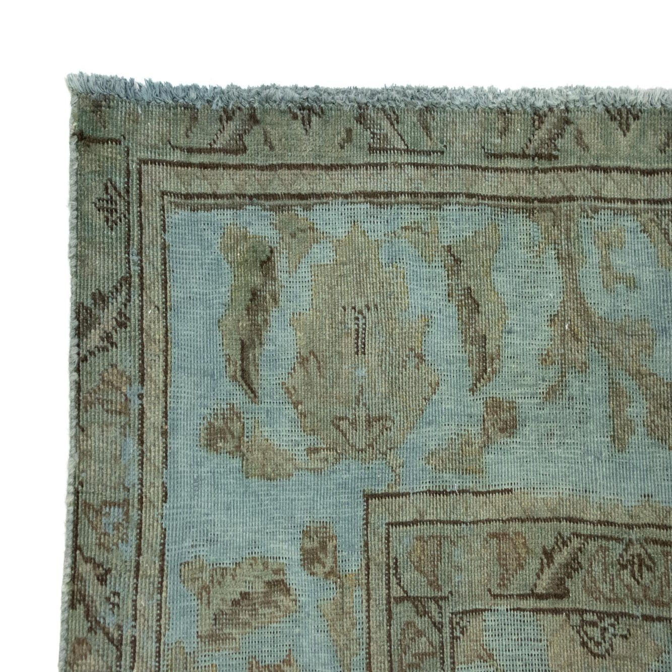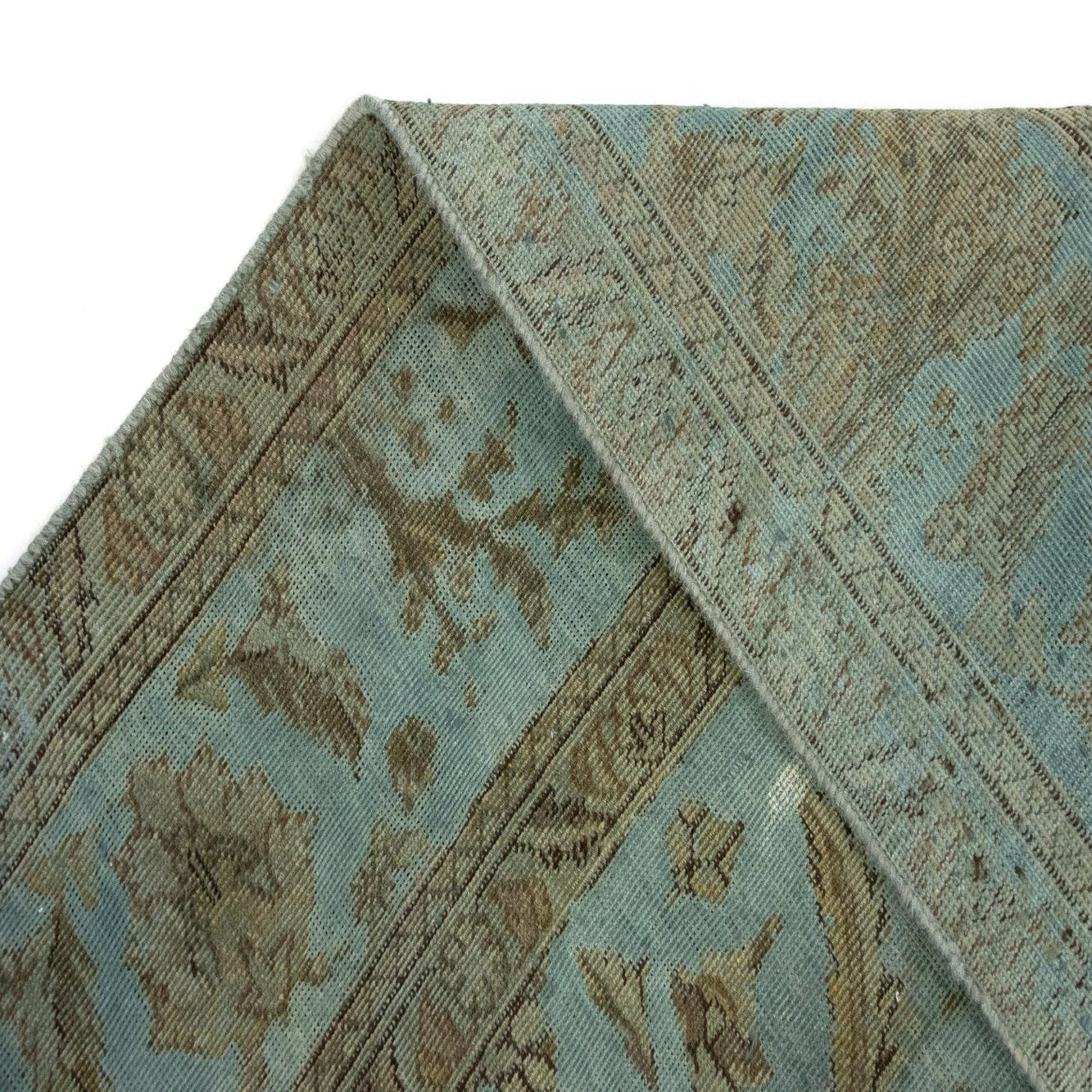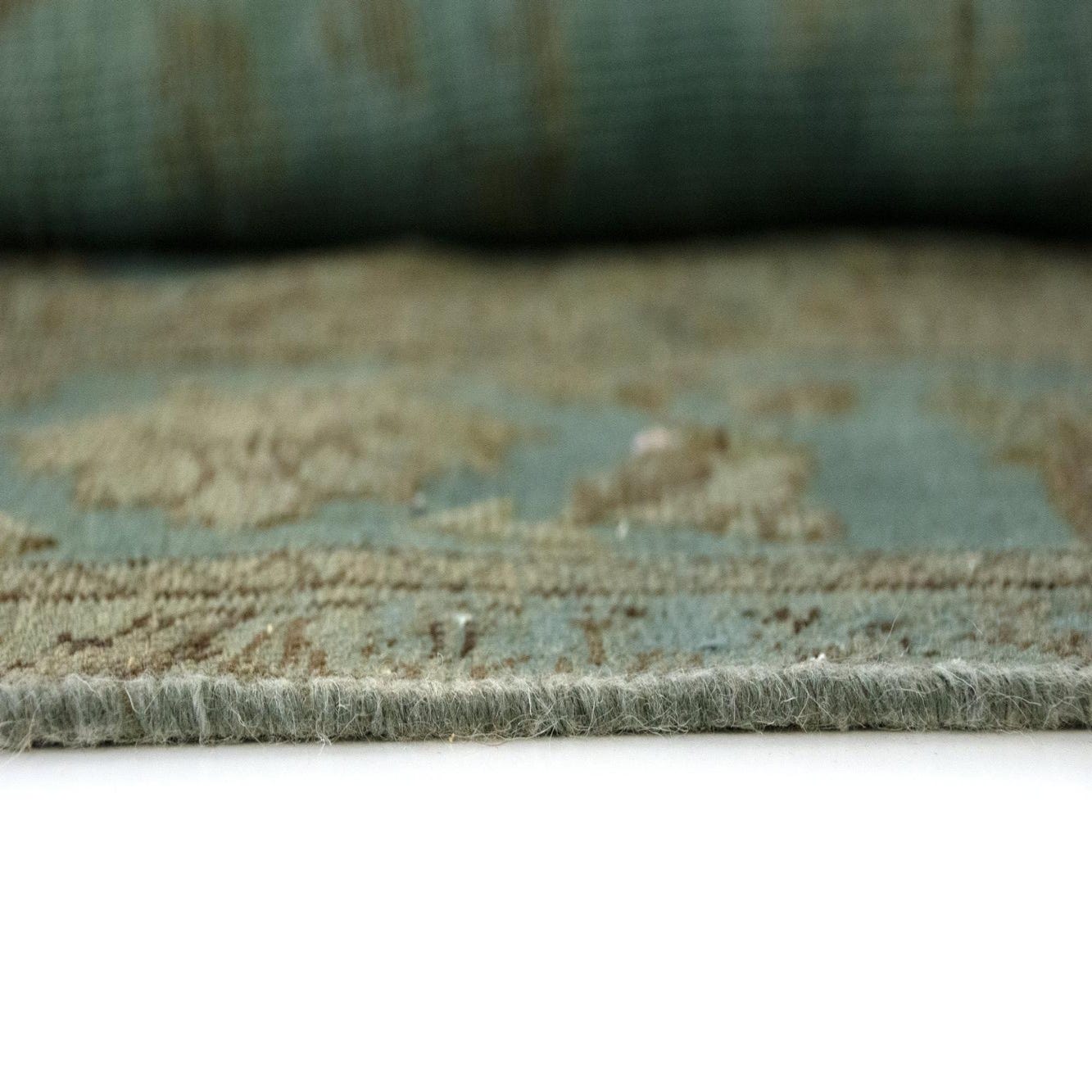 The rug boasts a rich blue background that provides a tranquil foundation, while intricate patterns in complementary shades of green and brown create a sophisticated visual landscape. Time-honored motifs, suggestive of palatial heirlooms, adorn the surface, lending the rug a sense of history and elegance.