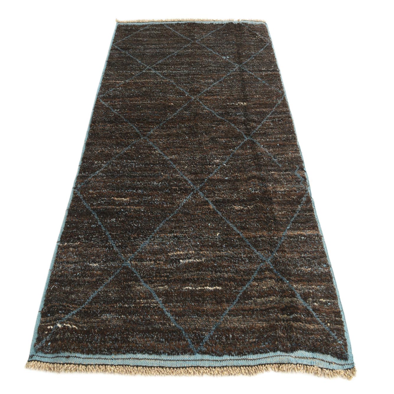 A 5x8 rectangular Moroccan shag rug in dark brown and tan with a blue tribal diamond pattern.