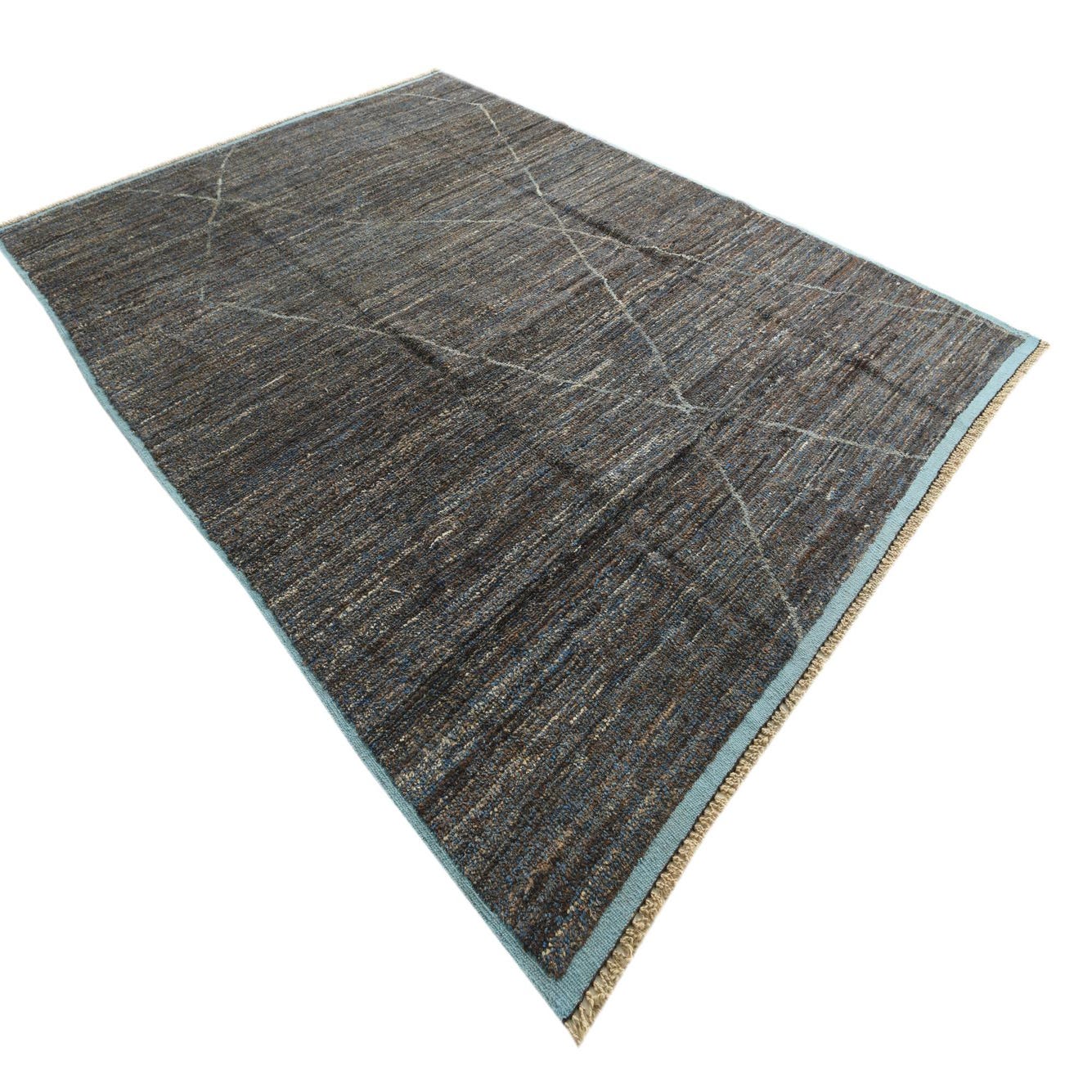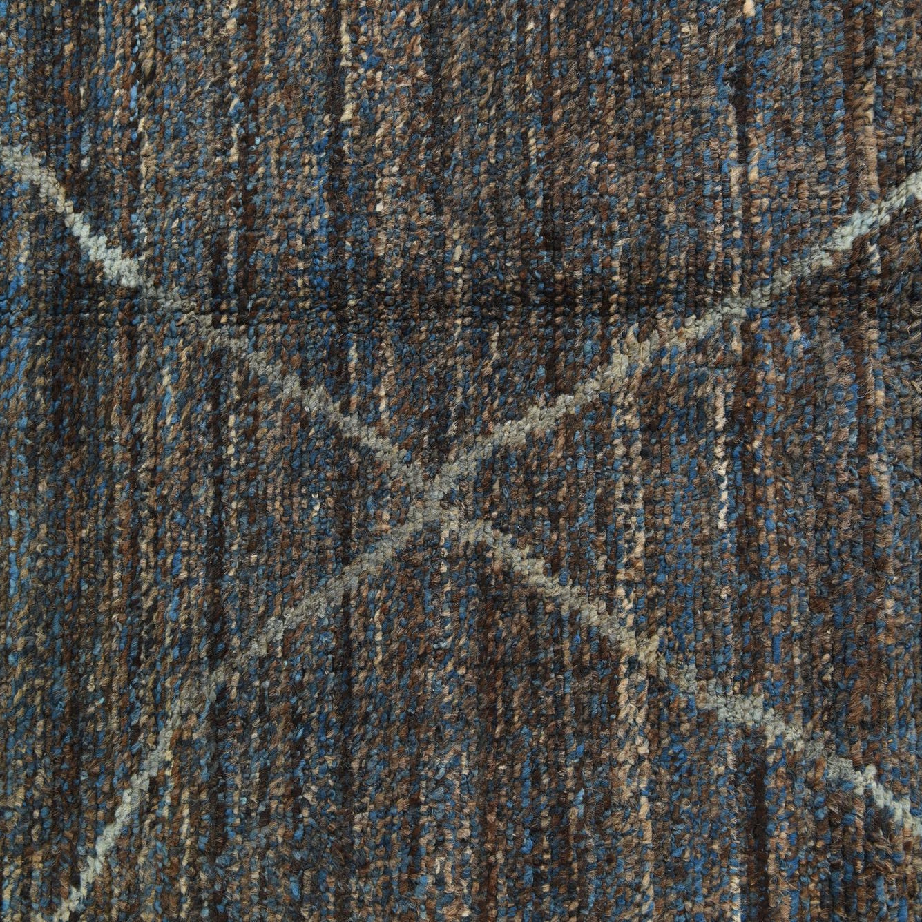 A 9x12 rectangular Moroccan shag rug with a tribal abstract pattern in blues and browns/tans, handmade from wool.