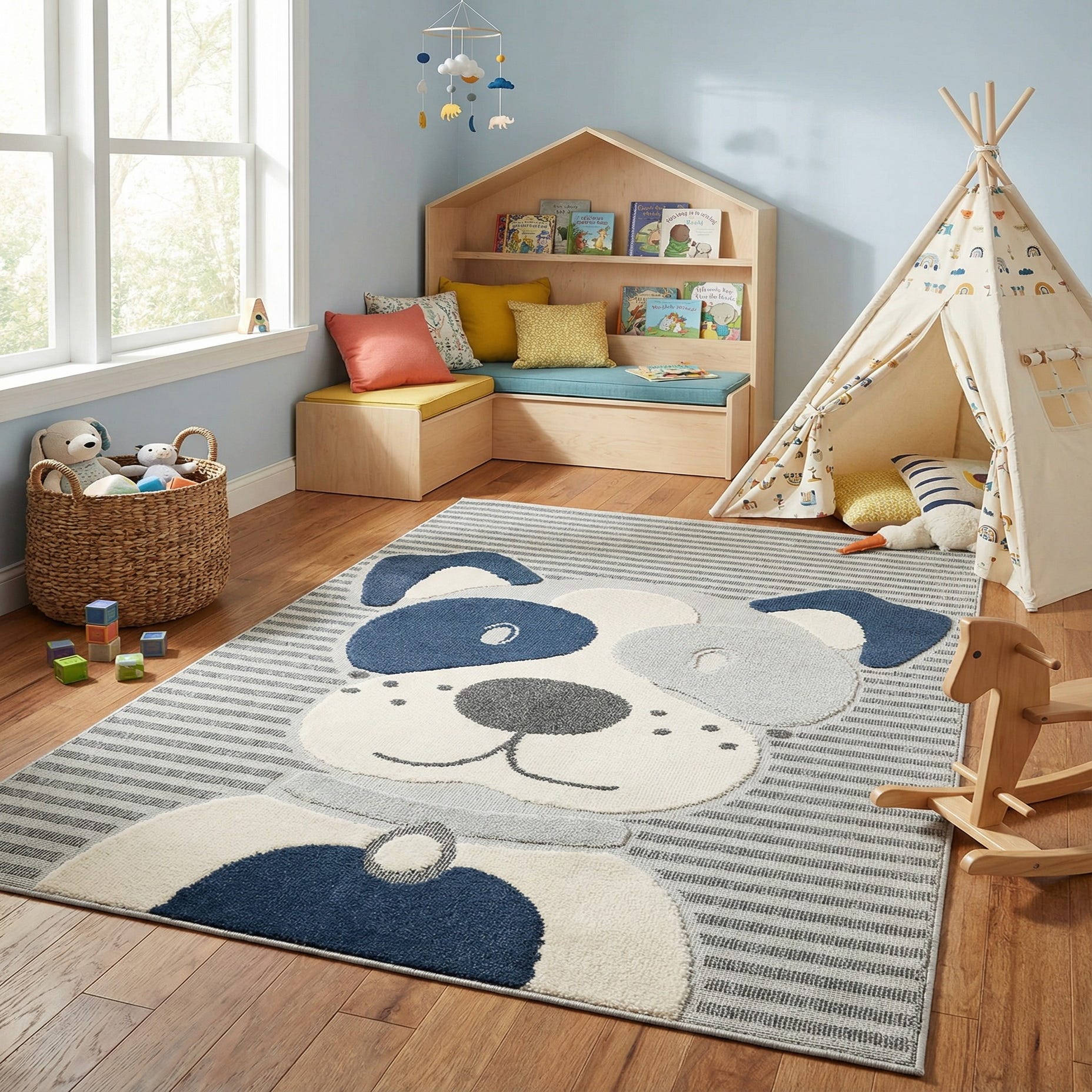 This design works well in a child’s bedroom, nursery, or playroom, where the friendly motif and calm Blue and Gray palette bring personality without overwhelming the space. It also pairs nicely with Scandinavian or contemporary décor, coastal-inspired color schemes, or a neutral modern setting as an accent that brightens a reading nook or anchors a play area. The balanced colorway and tactile pattern make it easy to coordinate with solid furniture and playful accessories.