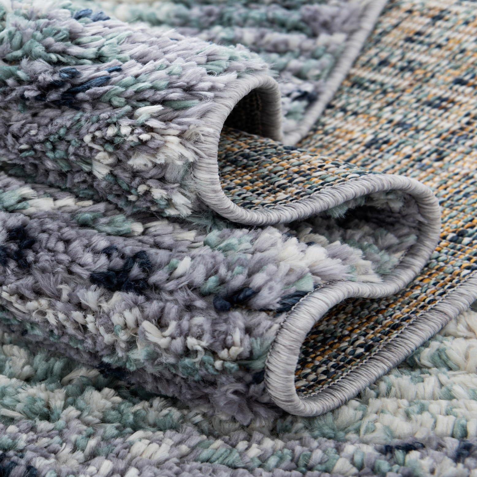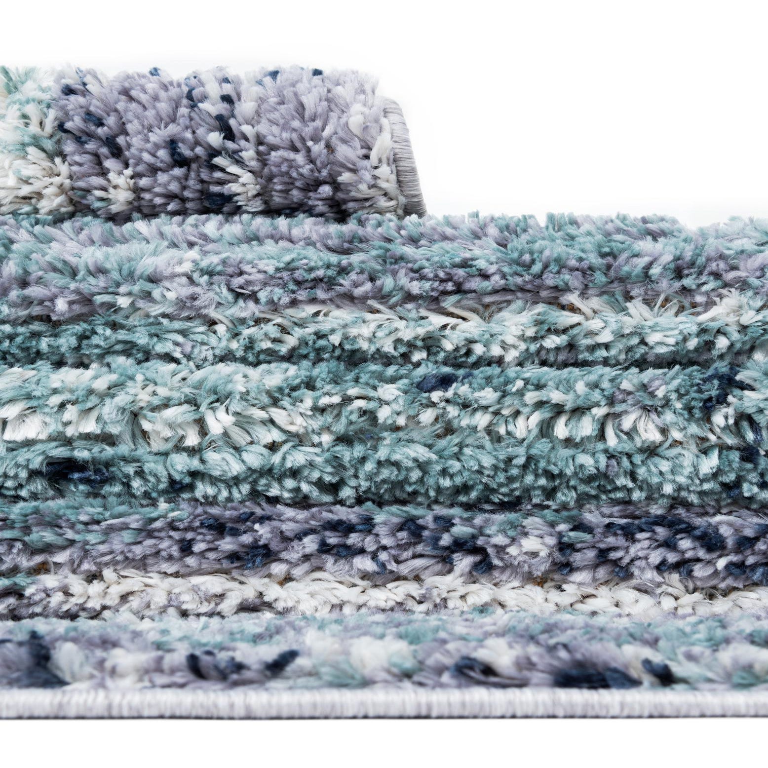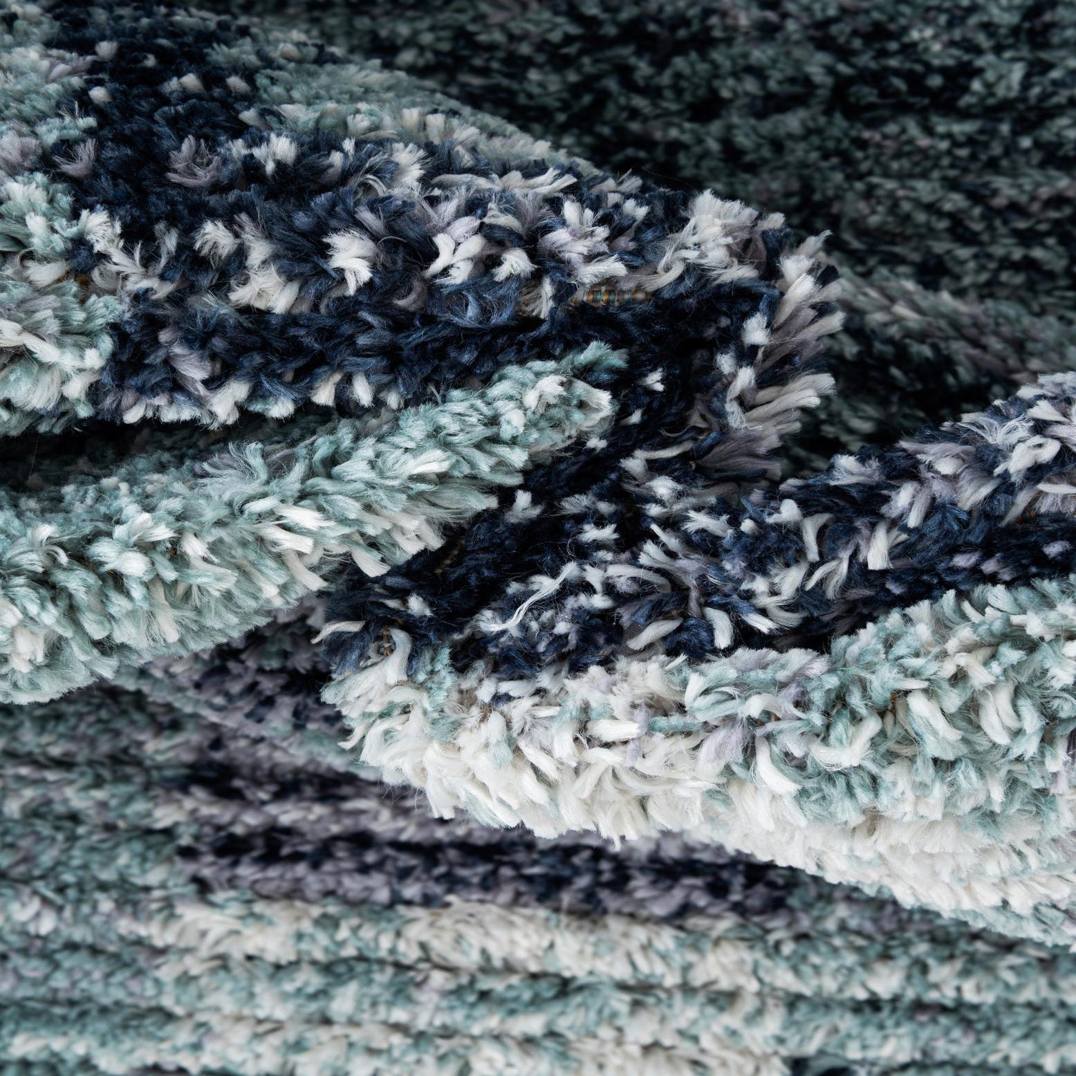 Place this rug to anchor a seating group in a contemporary living room, add a cool-toned layer to a coastal or transitional bedroom, or set it in an entry or reading nook where its shape and pattern can stand alone. It pairs well with light wood finishes, navy upholstery, and neutral grays — use it to introduce color without overpowering a space, or layer it atop hardwood or tile to create a defined focal area.