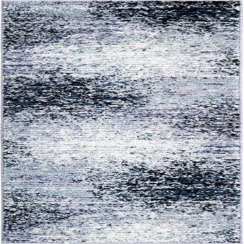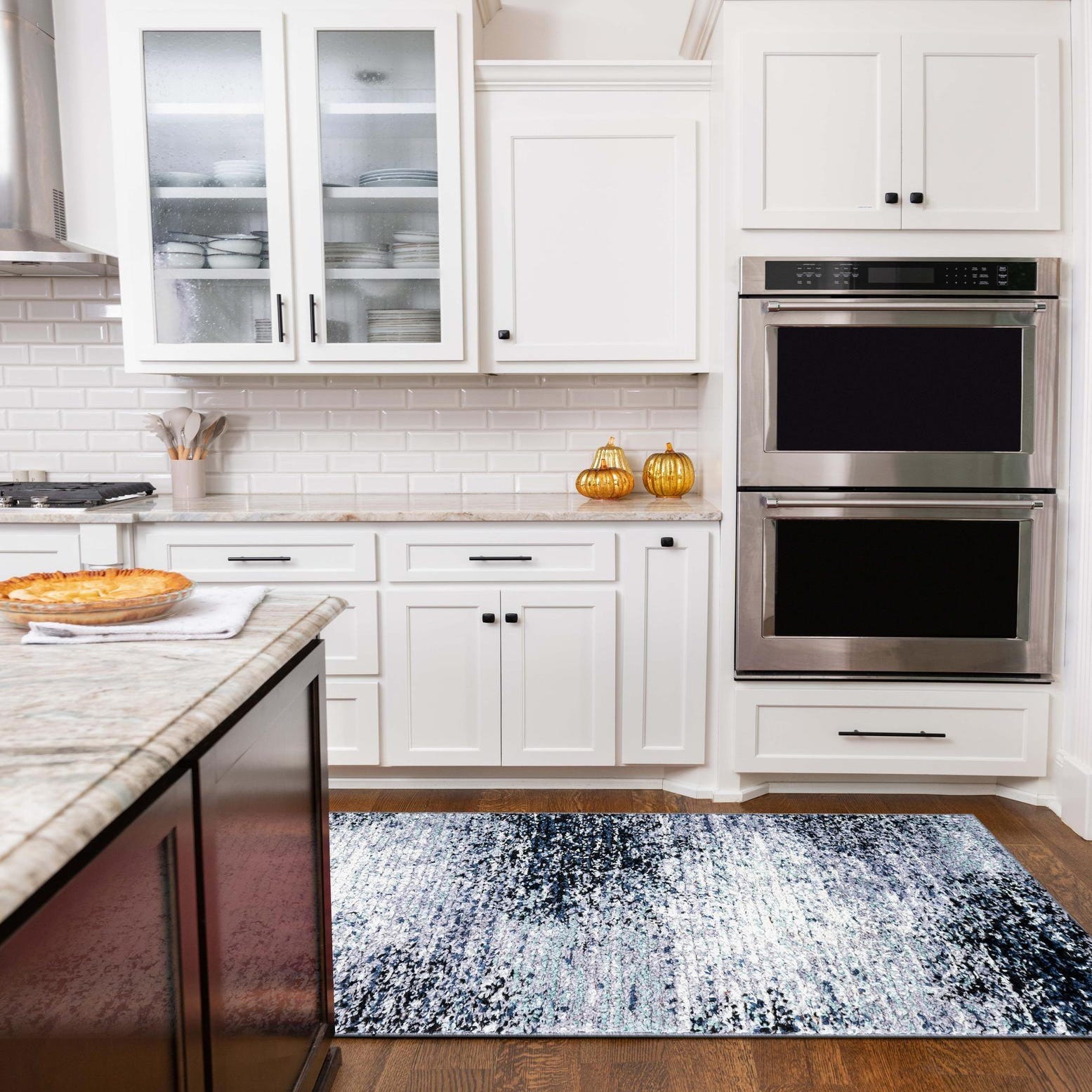 A long 8 ft runner rug with an abstract modern pattern in shades of blue, gray, and white, perfect for a hallway.