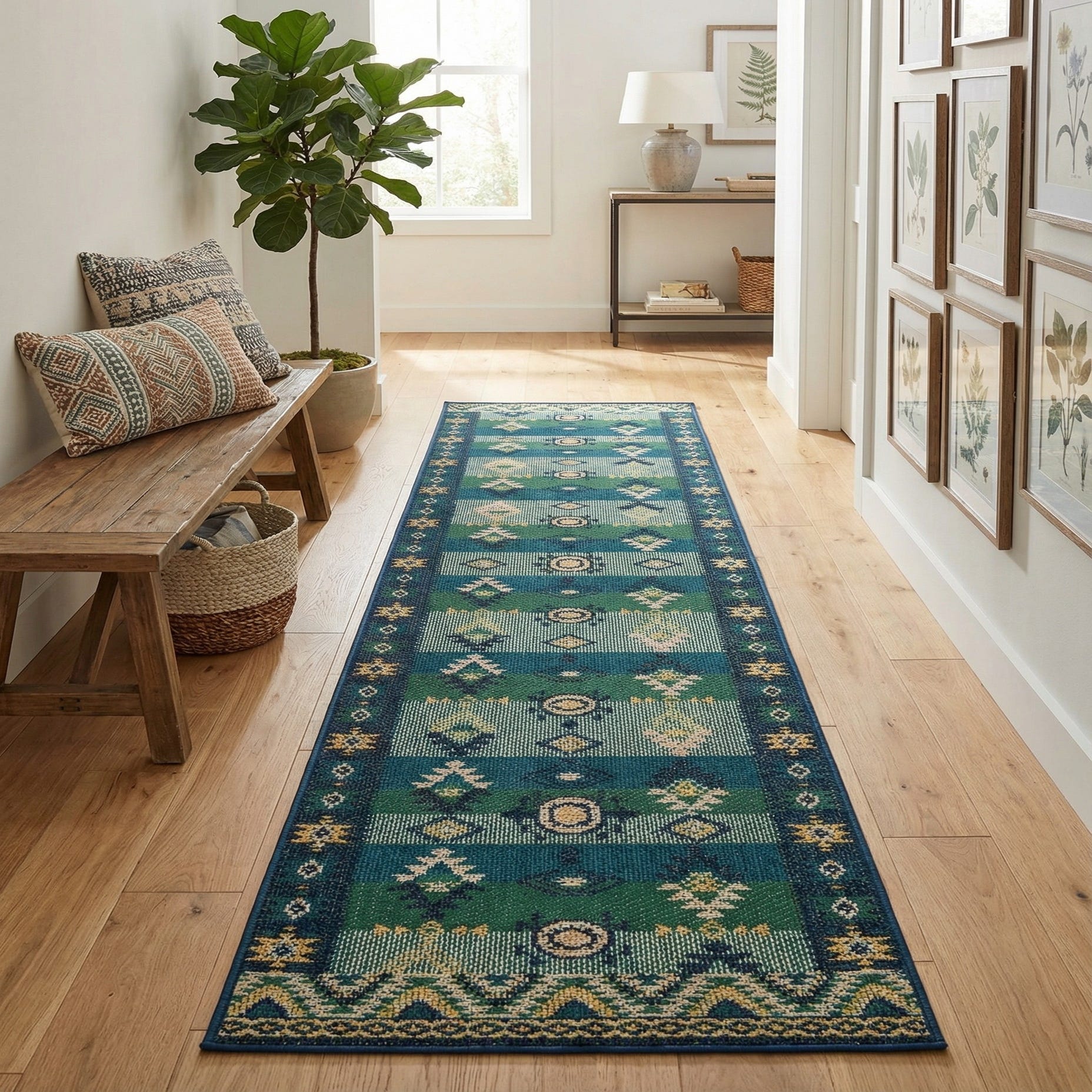 A 12 ft runner rug with a traditional geometric pattern in shades of blue, green, and beige, suitable for a hallway or patio.