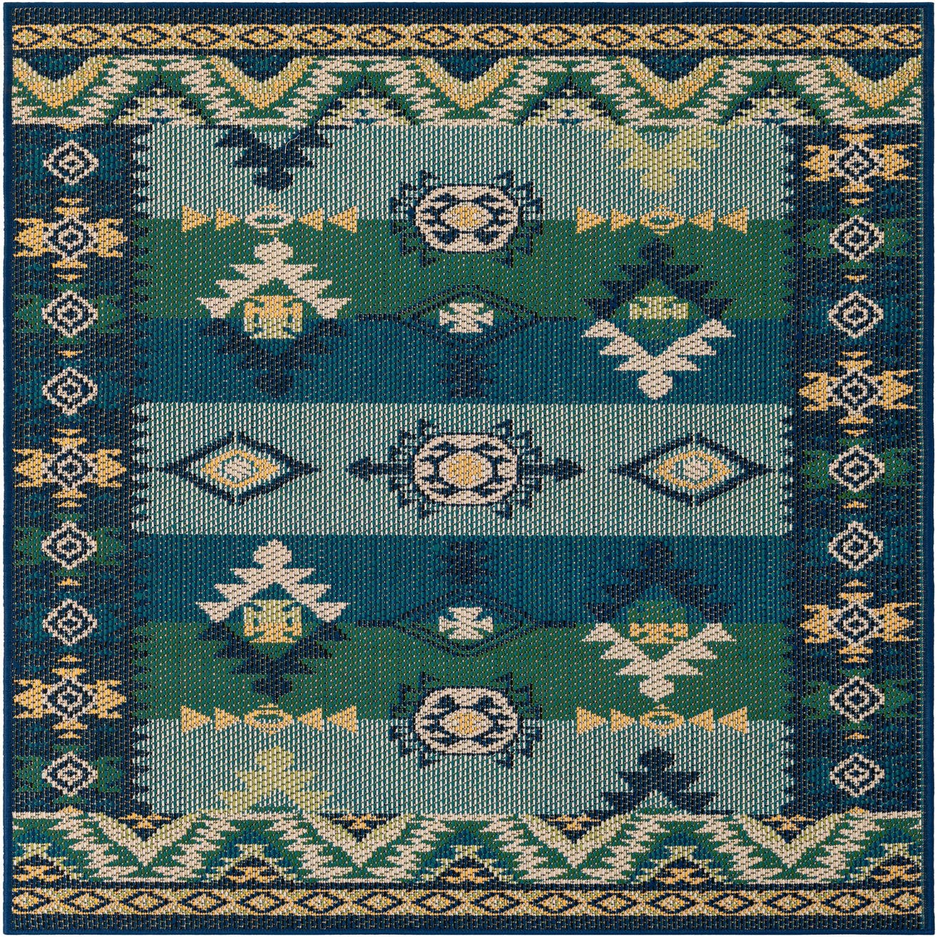 A banded, kilim-inspired design rests on a Blue and Green ground, with rows of geometric medallions, diamonds and chevron motifs in beige, ivory and navy blue. The pattern alternates horizontal stripes with framed border details for a structured, tribal look that reads both relaxed and intentional. Color contrasts are clear but restrained, giving the design visual depth without overwhelming a space.