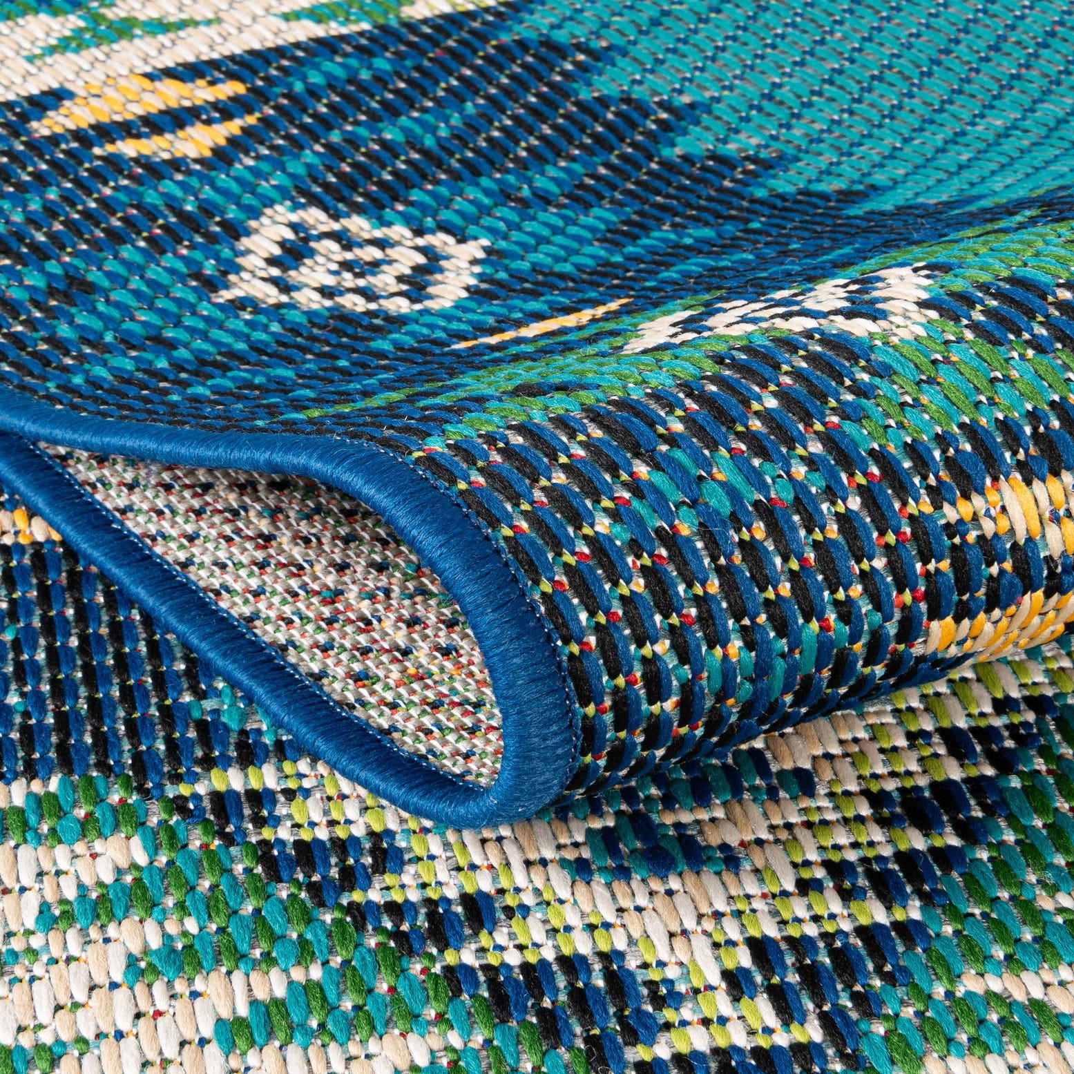 Blue-and-green background sets a lively stage for a layered, geometric pattern that alternates medallions, diamond motifs and floral-inspired accents. Navy-blue outlines and ivory and beige highlights create clear contrast across the woven bands, while a narrow patterned border frames the composition. Machine-made of 100% polypropylene, the flat-woven surface has a pleasantly textured hand—firm and tightly constructed underfoot with a subtle raised feel where the pattern shifts.
