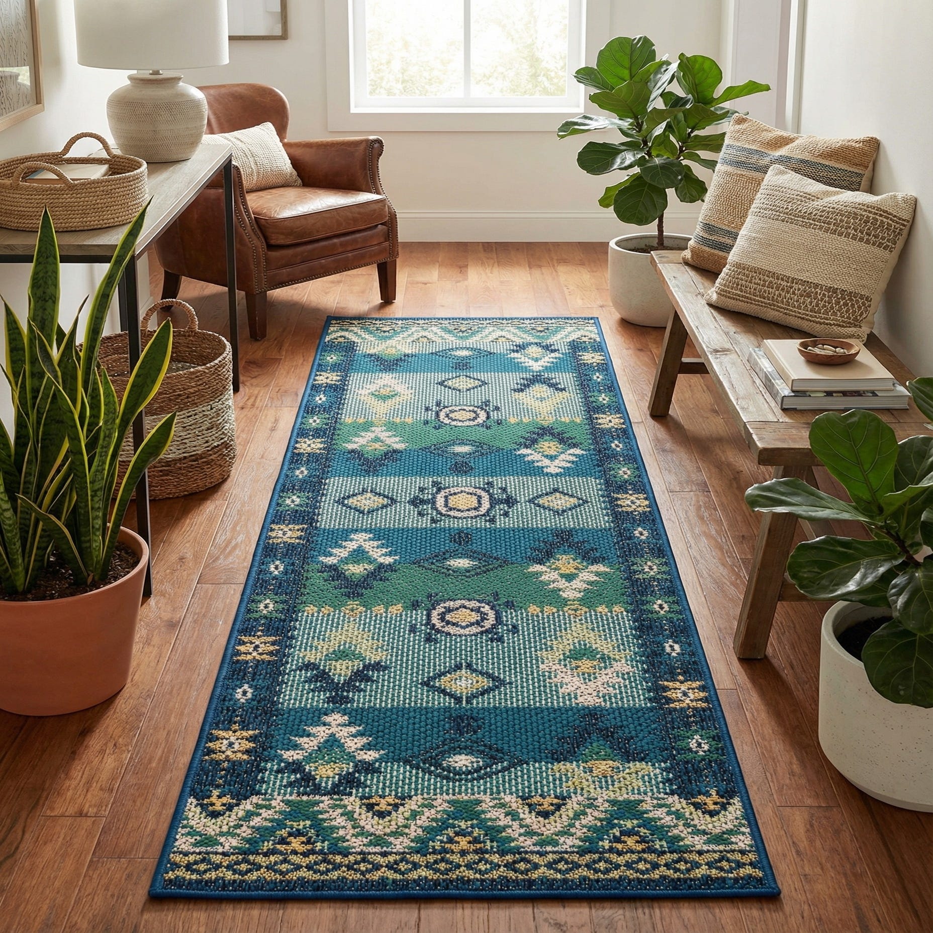 A 6 ft runner rug featuring a vibrant traditional pattern in blues, greens, and yellow, suitable for hallways or patios.