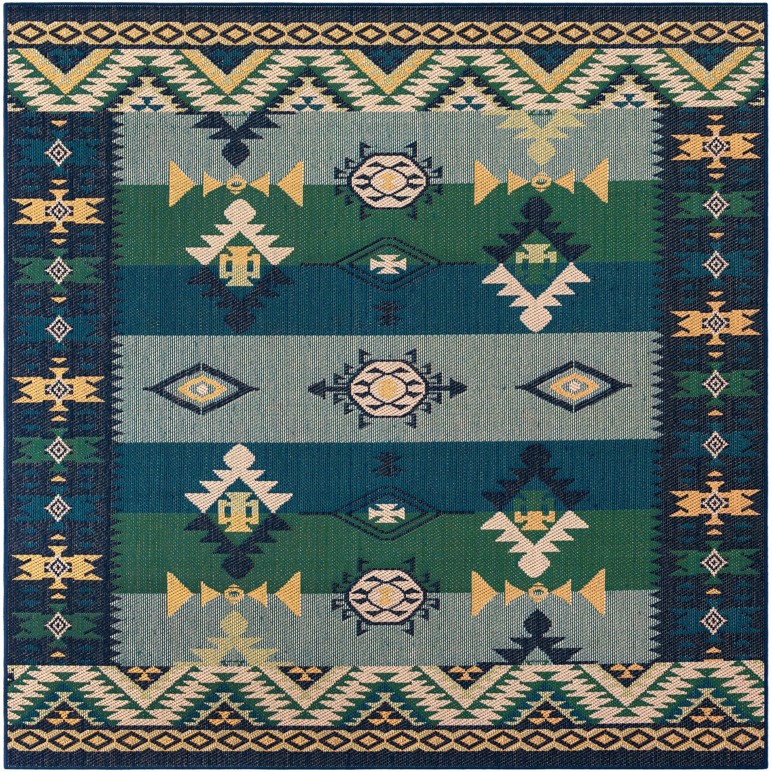 A layered stripe layout of alternating blue and green bands frames tribal-inspired geometric motifs in beige, ivory, navy and tan. The central field alternates broad horizontal stripes with stepped diamond medallions, compass-like roundels and small lozenge accents, while a serrated chevron border and narrow patterned guard create a finished, structured edge. Machine-made of 100% polypropylene, the rug has a low-profile, flat-woven texture that feels firm underfoot and shows crisp pattern definition and color contrast.