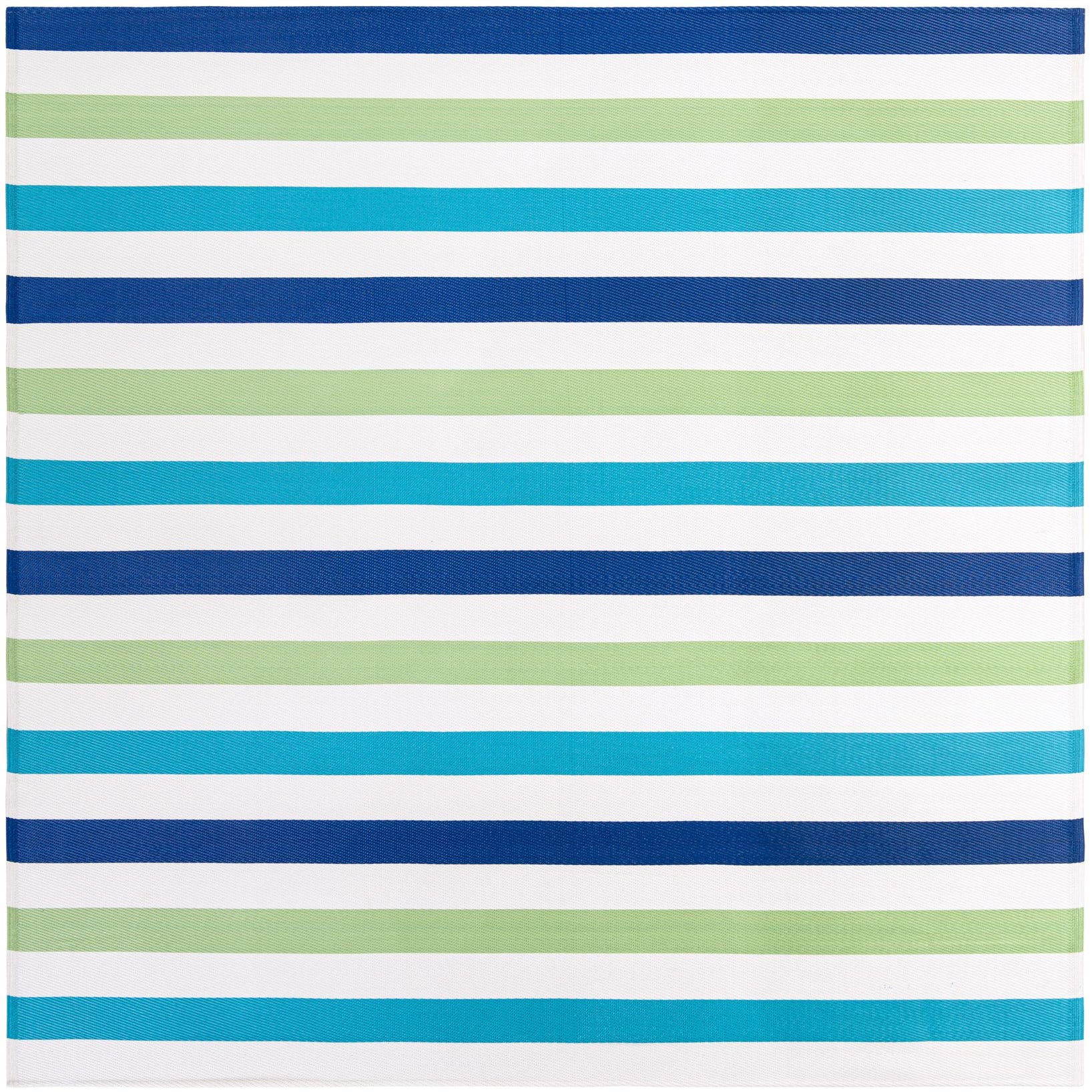 Broad, horizontal bands of color create a clean, contemporary stripe that brings a relaxed, coastal energy to a room. The design alternates vivid navy, bright aqua and teal, and a soft green across a blue-and-green background, with crisp ivory separators that keep the pattern feeling fresh and balanced. Machine-made from 100% polypropylene, the rug is intended for outdoor living and offers a low-profile look that complements modern and casual settings.