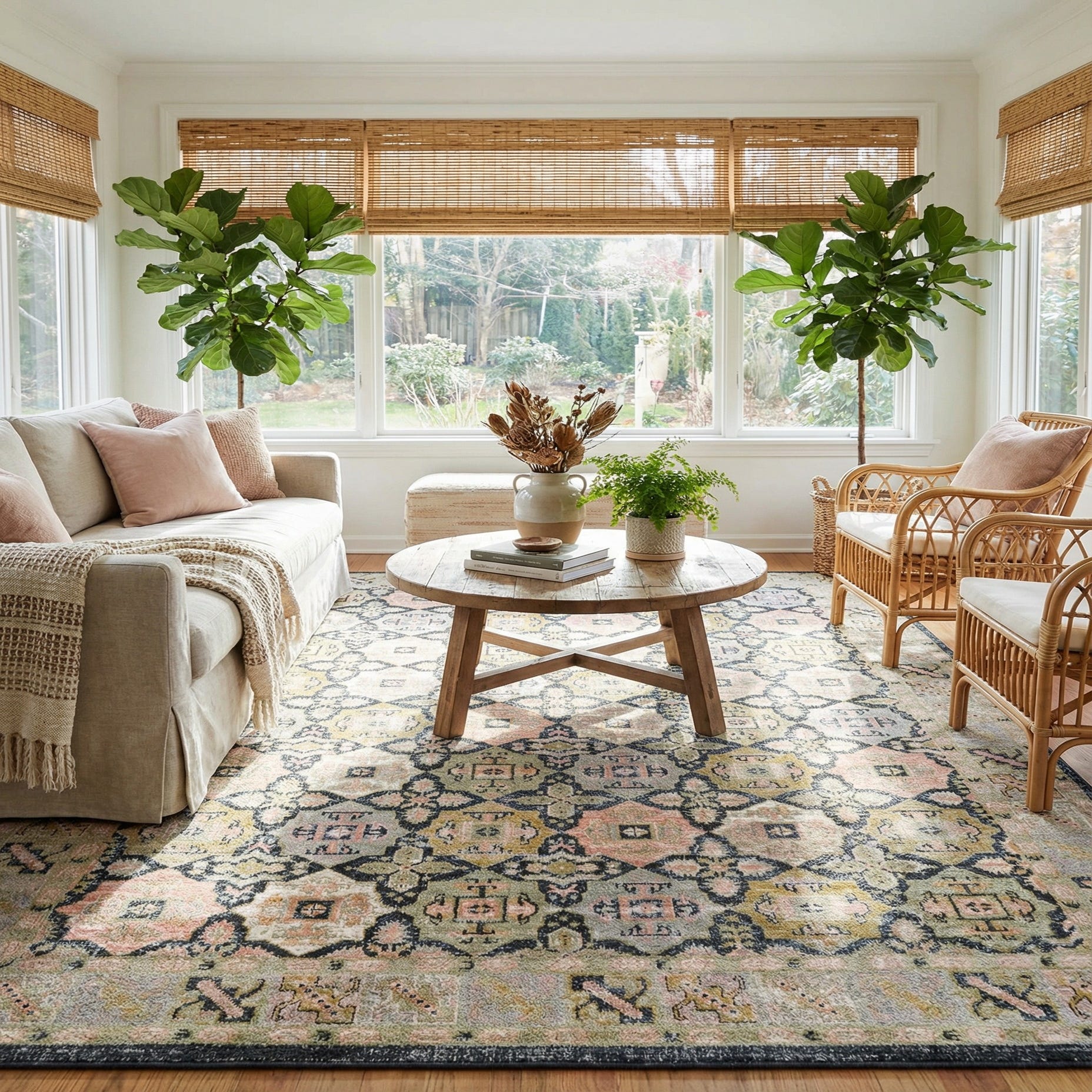Primary color is Blue and Green. Colors in this rug include: Blue and Green, Ivory, Pink, Black, Light Blue.
