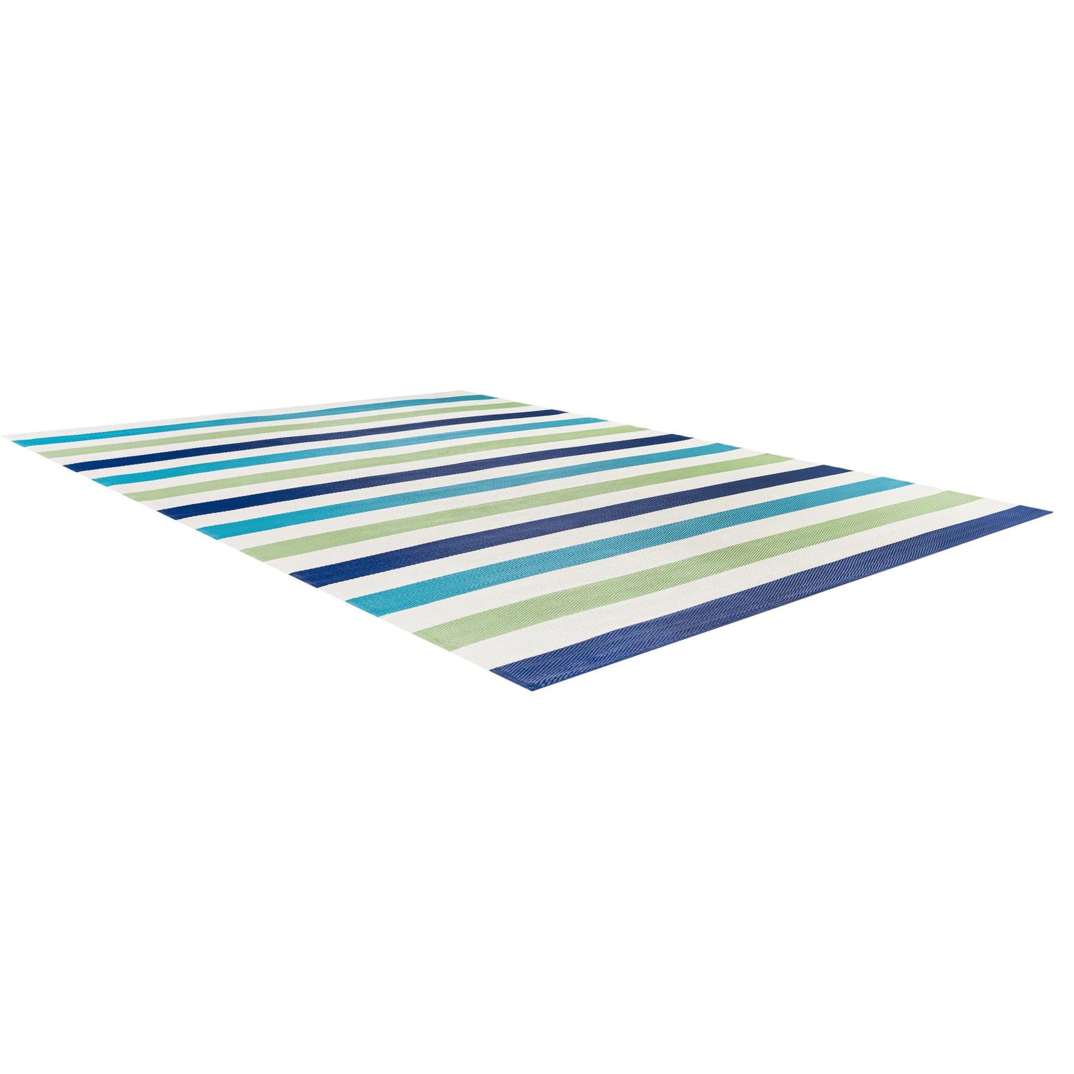 A clean, horizontal stripe design balances cool coastal colors with a fresh, casual style. Bands of deep navy, light blue, soft green and ivory run across a blue-and-green ground, creating a crisp, rhythmic pattern that reads both relaxed and modern. Machine made from 100% polypropylene, the rug has a low-profile, tightly woven surface with a subtle ribbed texture; it feels smooth and slightly firm underfoot while holding its shape in outdoor settings.
