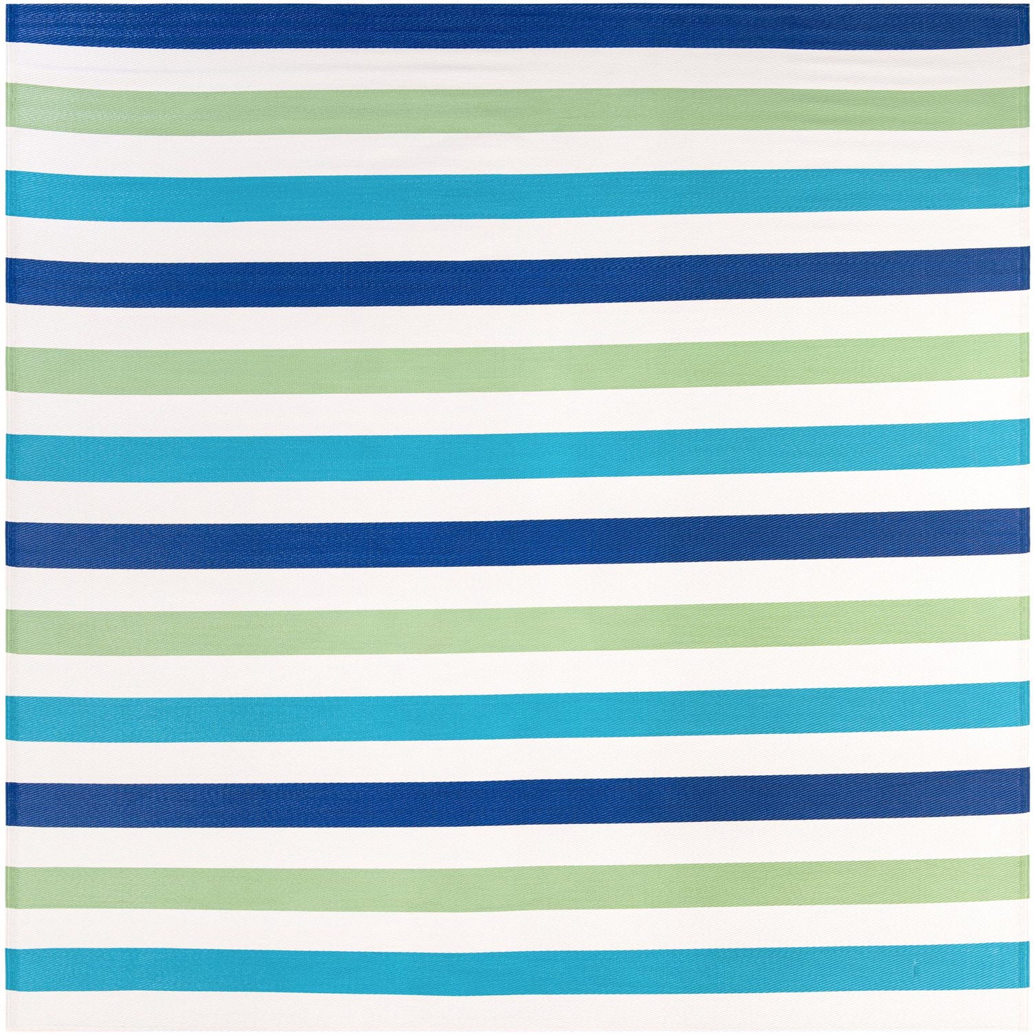A clean, horizontal stripe design balances cool coastal colors with a fresh, casual style. Bands of deep navy, light blue, soft green and ivory run across a blue-and-green ground, creating a crisp, rhythmic pattern that reads both relaxed and modern. Machine made from 100% polypropylene, the rug has a low-profile, tightly woven surface with a subtle ribbed texture; it feels smooth and slightly firm underfoot while holding its shape in outdoor settings.