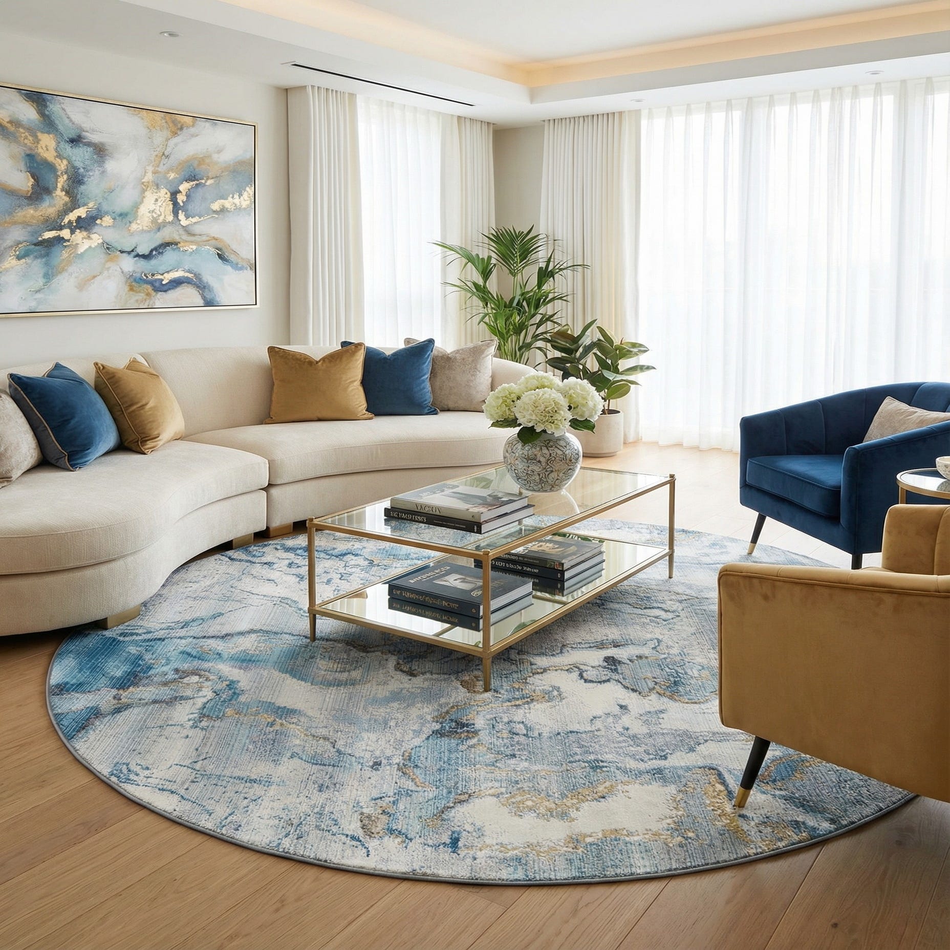 A 10' round blue and ivory abstract modern rug with gold accents, suitable for indoor or outdoor use.