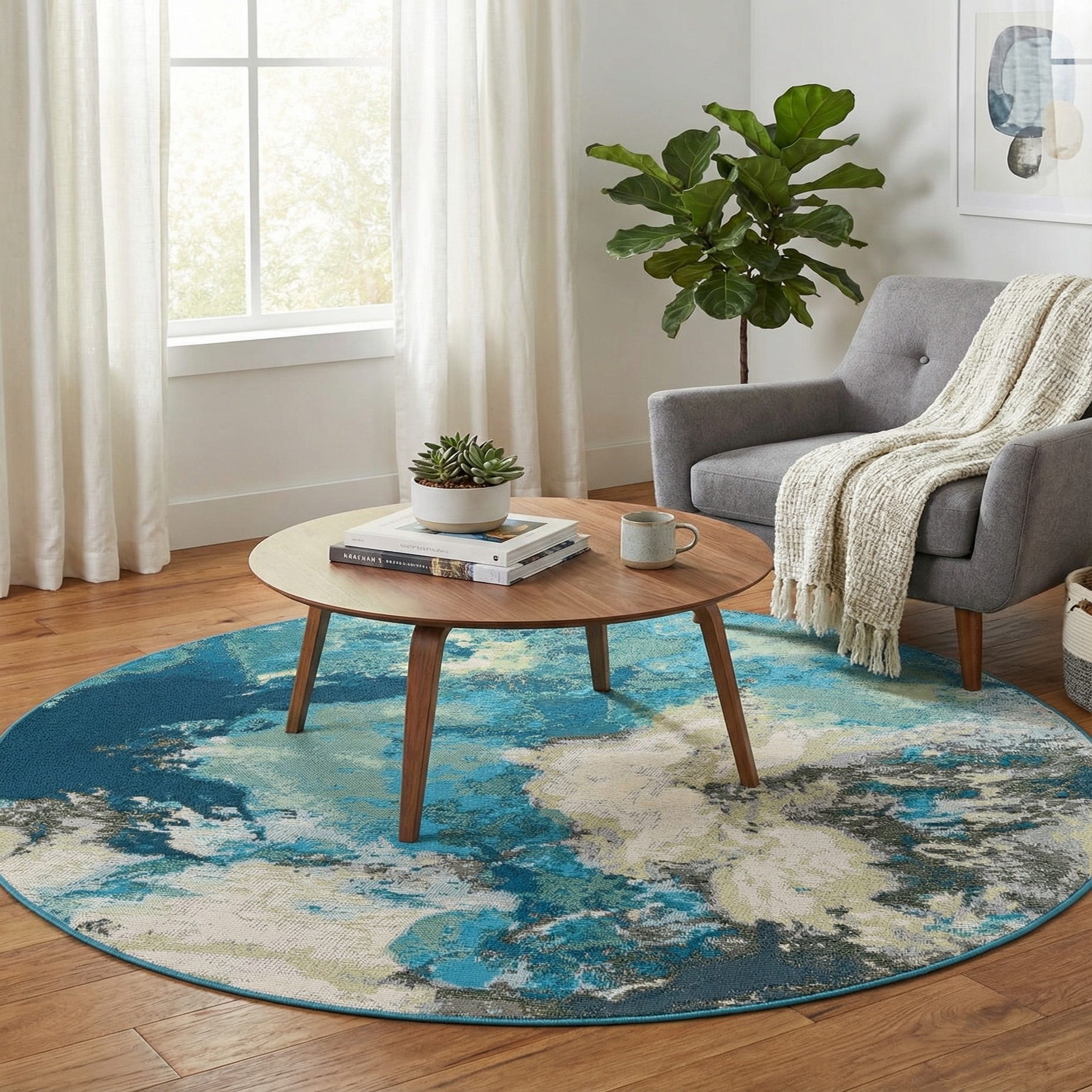 This round rug's contemporary design and rounded shape can effortlessly anchor a seating area, adding a touch of modern flair. It is well-suited for outdoor patios, decks, and porches, as well as indoor spaces that benefit from a durable yet decorative floor covering, such as sunrooms, playrooms, or dining areas. The rug's vibrant hues and dynamic pattern could harmonize with minimalist decor, providing a splash of color, or complement coastal and contemporary settings that celebrate natural elements and hues.