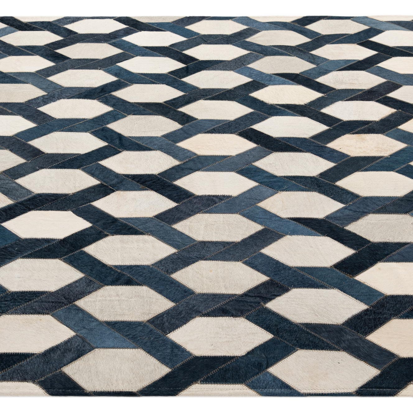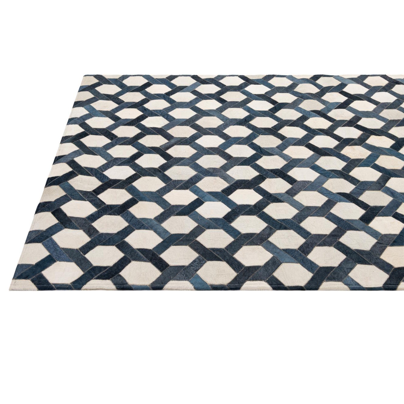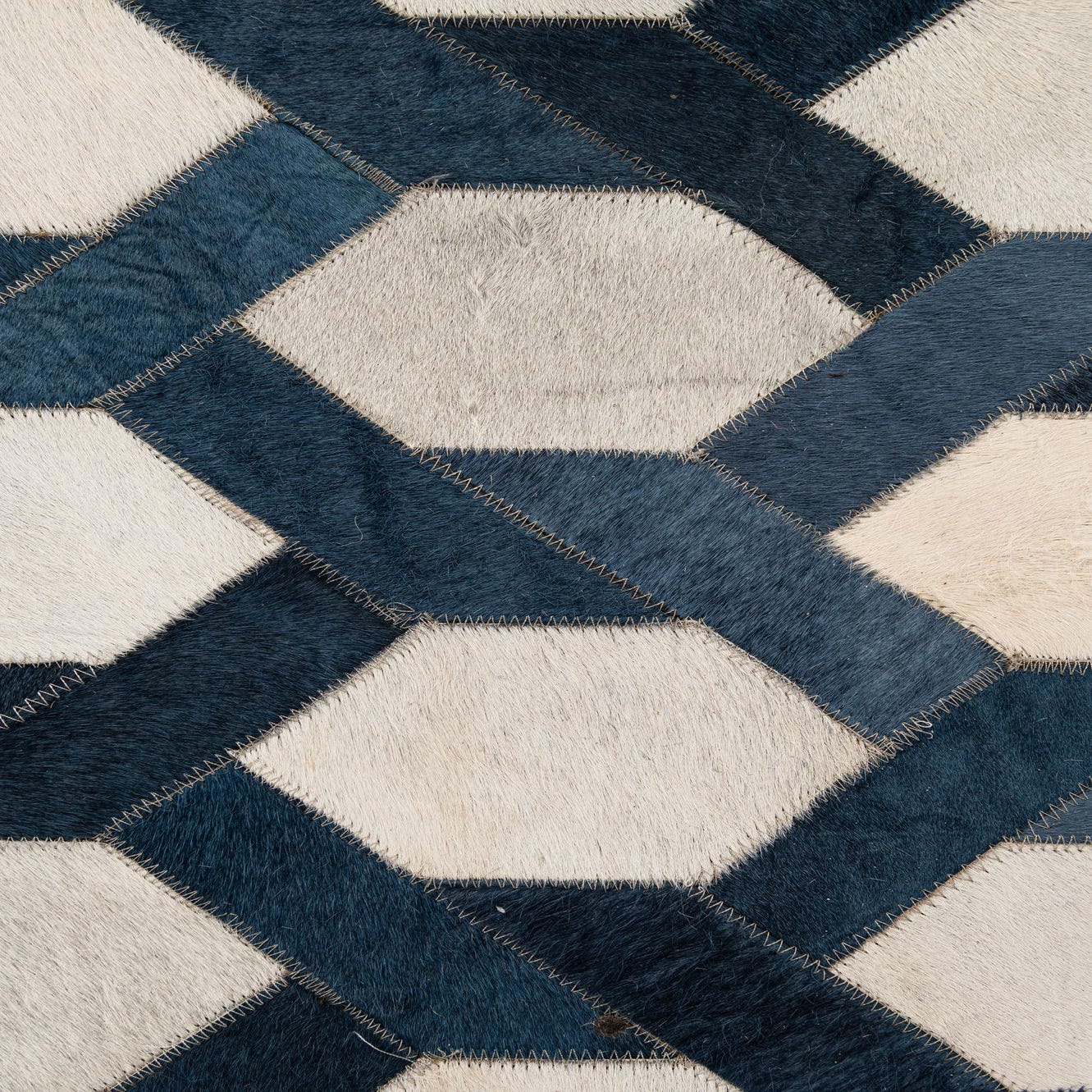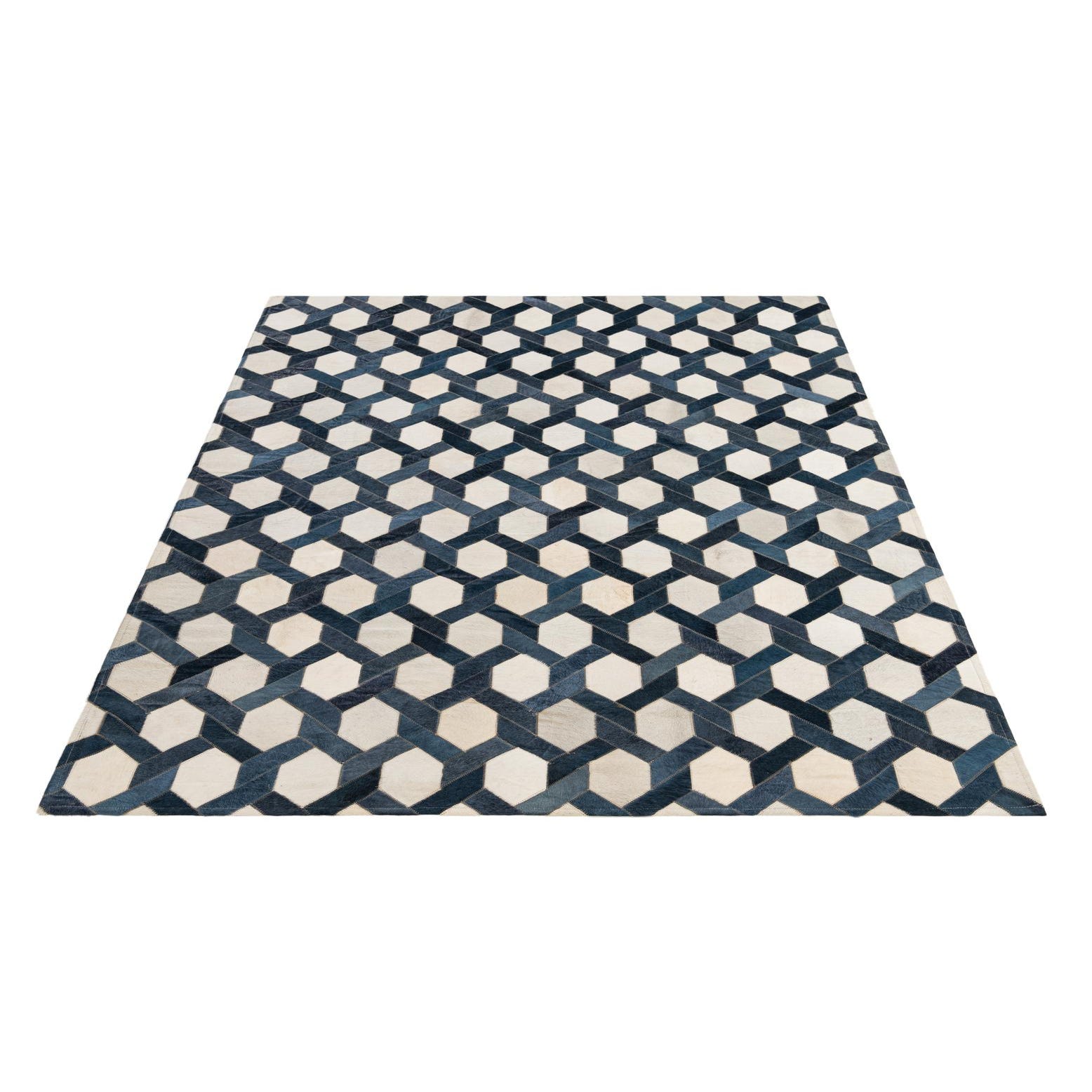 A 5x8 rectangular Cowhide - Patchwork rug featuring a modern geometric pattern in shades of blue, ivory, and cream.