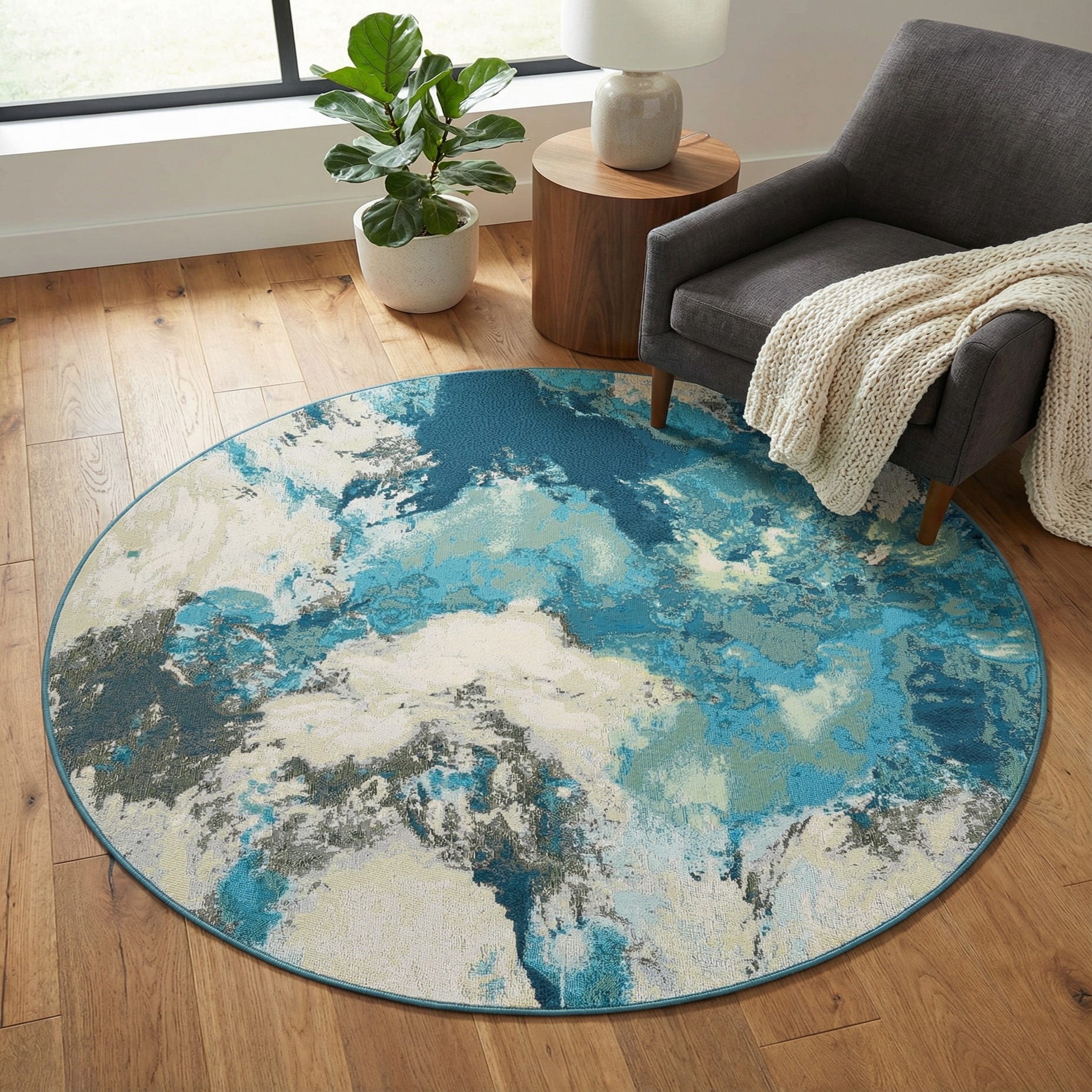 A 6'1" round blue, teal, and ivory abstract area rug with a modern coastal pattern, suitable for indoor or outdoor use.