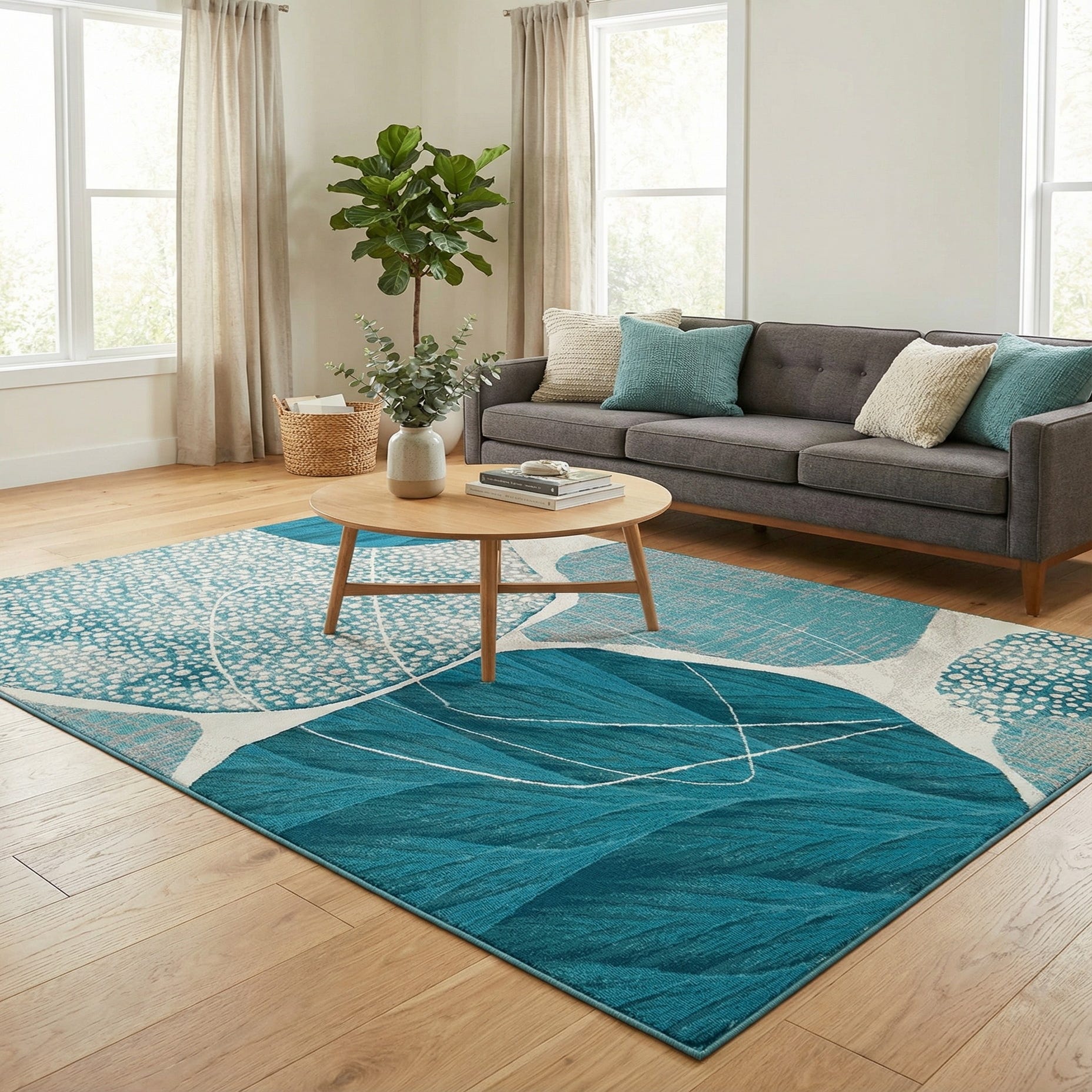A 6x9 rectangular rug featuring an abstract coastal design with large blue leaf-like shapes and ivory textured patterns, suitable for indoor/outdoor use.