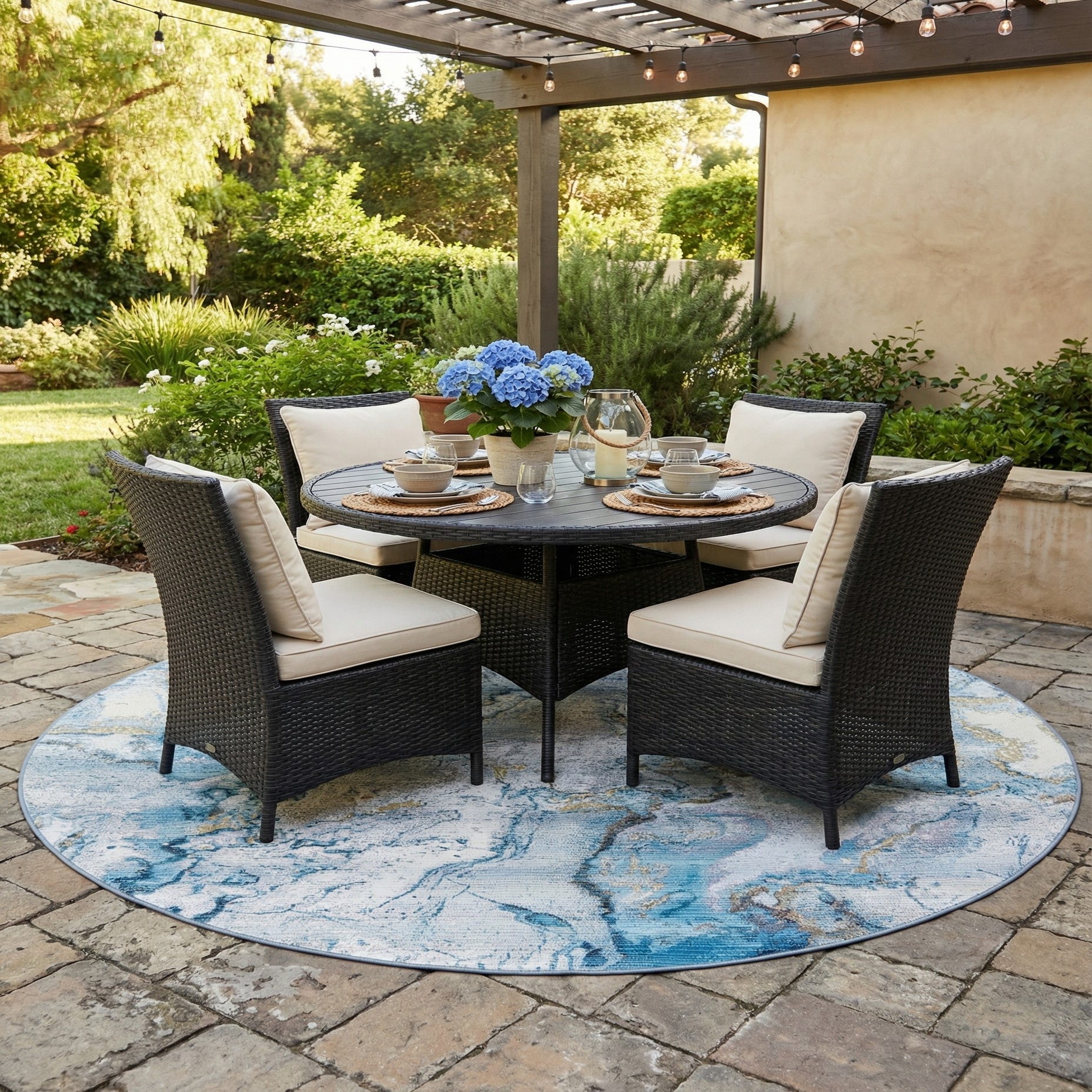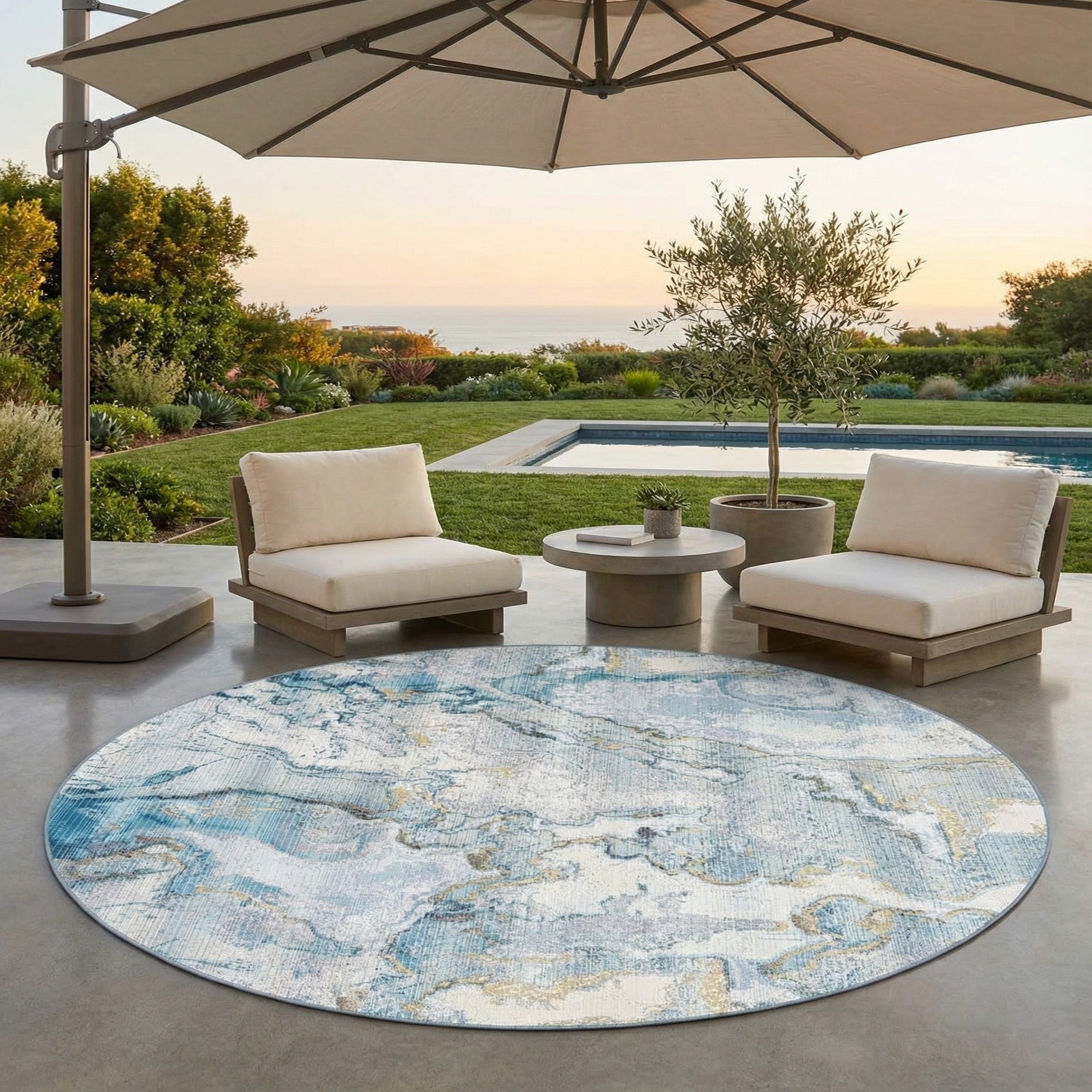 This round rug works well beneath a circular dining table or as a focal point in a covered patio seating area, anchoring modern coastal, transitional, or light-filled living spaces. Pair it with weather-resistant rattan or painted wood furniture for relaxed outdoor rooms, or layer it with soft linen upholstery and brushed metal accents in a sunroom or entryway to balance the palette and introduce a calm, contemporary element.
