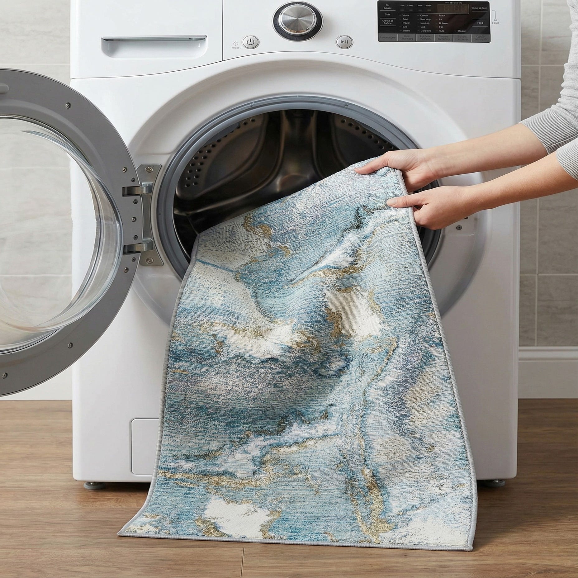 This runner pairs naturally with coastal and modern interiors—layer it along a bright hallway, anchor a narrow kitchen or galley, or place it in a sunroom to echo pale wood tones and crisp white trim. It also suits transitional living spaces when you want a soft, painterly statement that ties together neutral upholstery, brushed metal accents, and pale blue or green accessories.