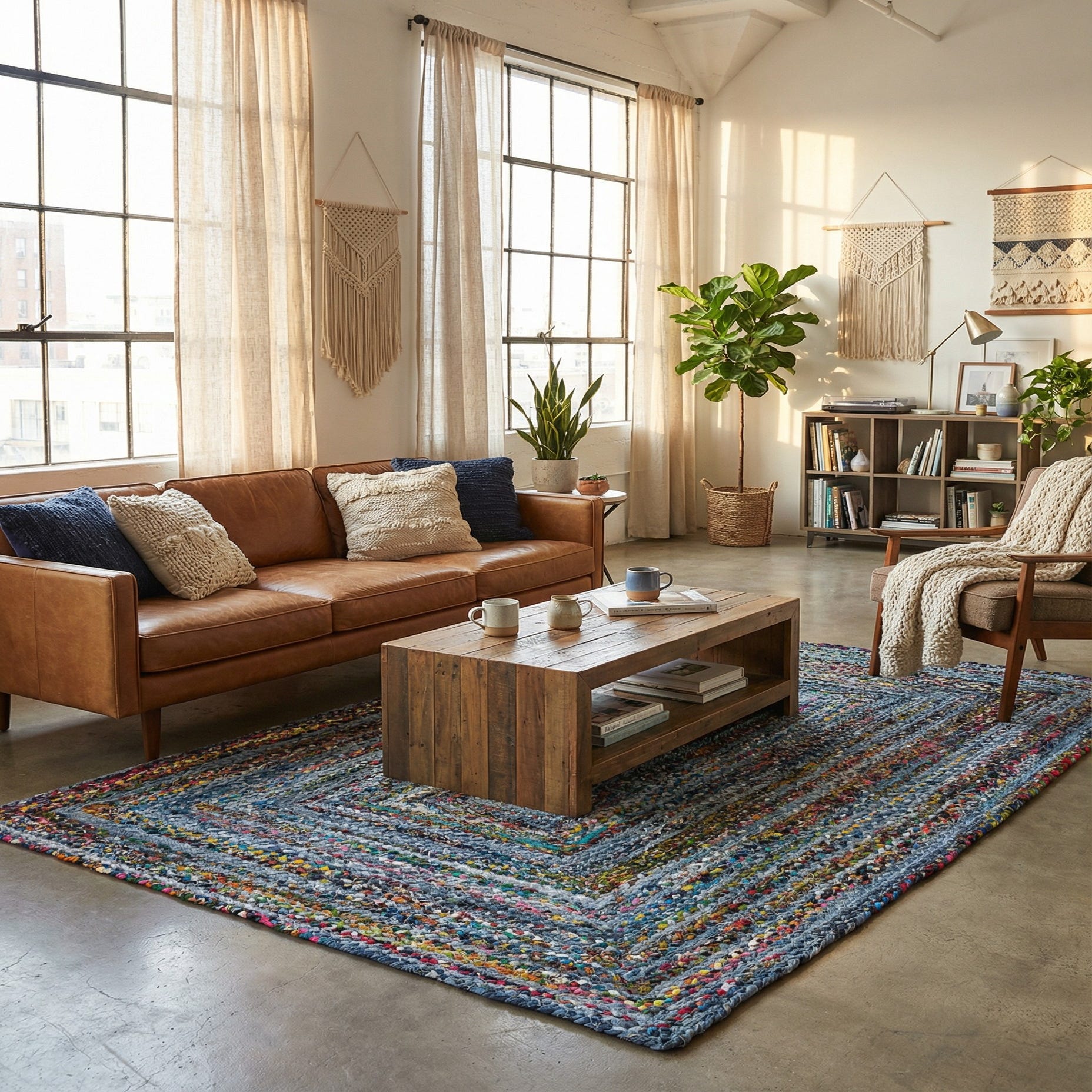 This rug fits a range of relaxed interiors: place it beneath a low coffee table in a casual living room, layer it in a sunlit reading nook, or anchor an eclectic dining area with reclaimed wood furniture. It pairs naturally with denim and navy upholstery, warm wood tones, and colorful accent pillows for a collected, lived-in look. The multicolor braiding also works well in children's or creative spaces where playful color and durable, washable fibers are welcome.