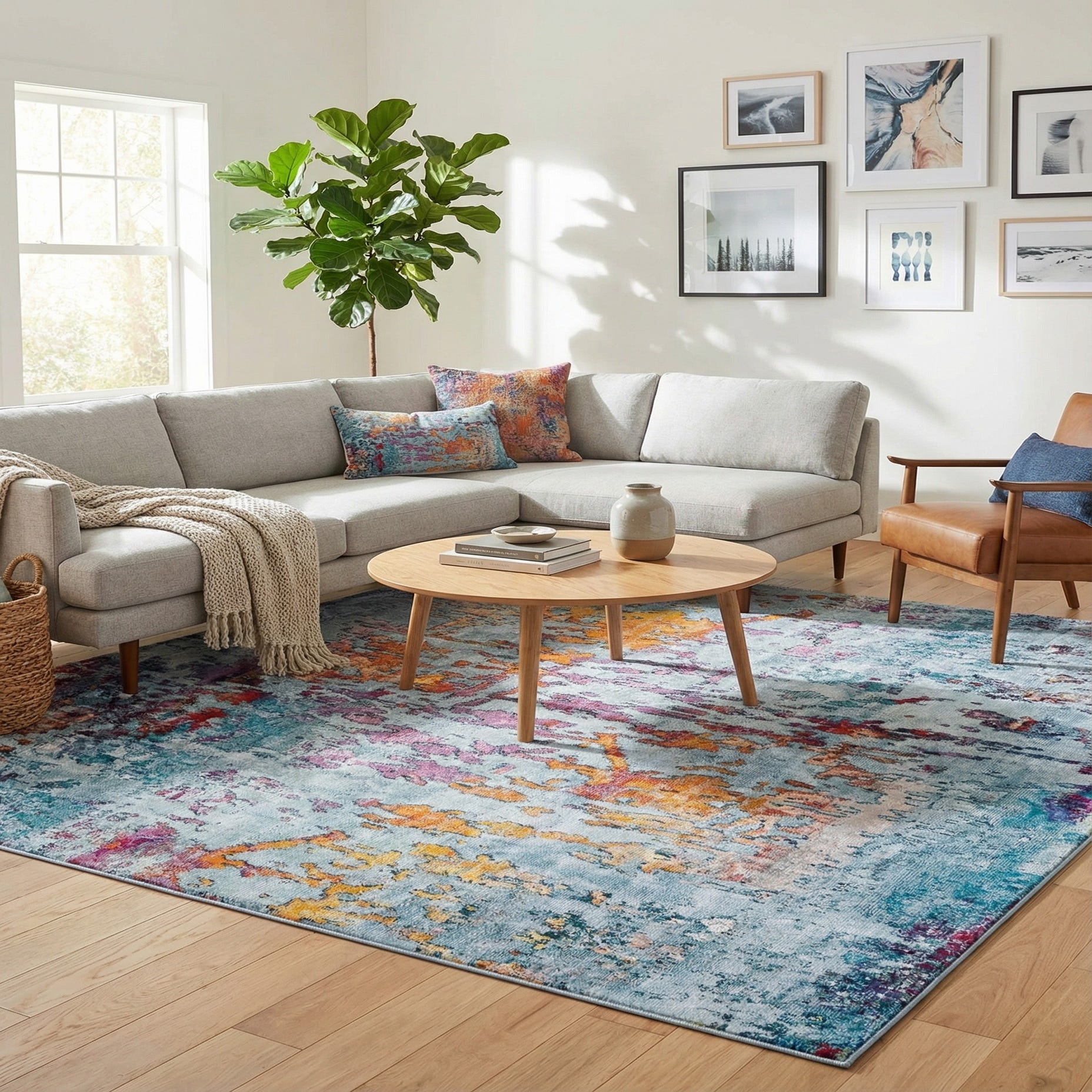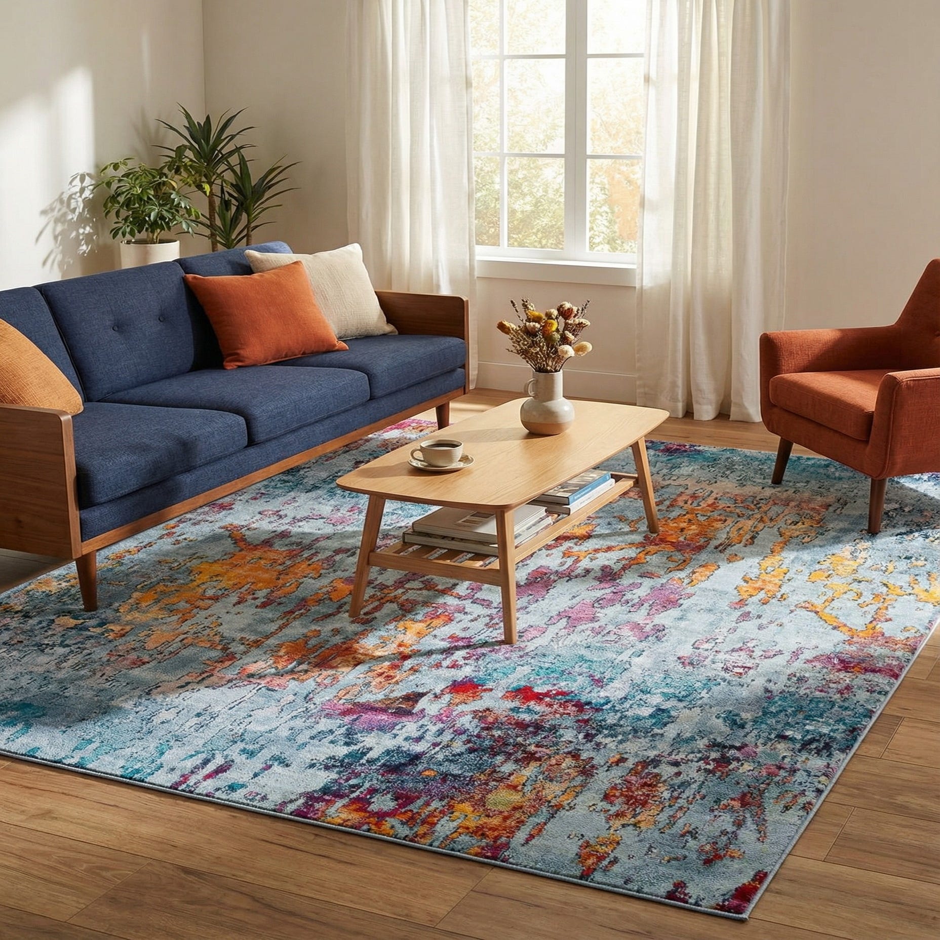 An abstract, painterly pattern gives this piece a modern, artful presence. Broad washes of Blue and Multi form the background while vibrant accents of Orange, Yellow, Turquoise and Magenta punctuate the surface like dripping paint. Streaks of Gray, Black and touches of Ivory add depth and contrast, creating a layered, slightly distressed look that reads contemporary without strict symmetry.