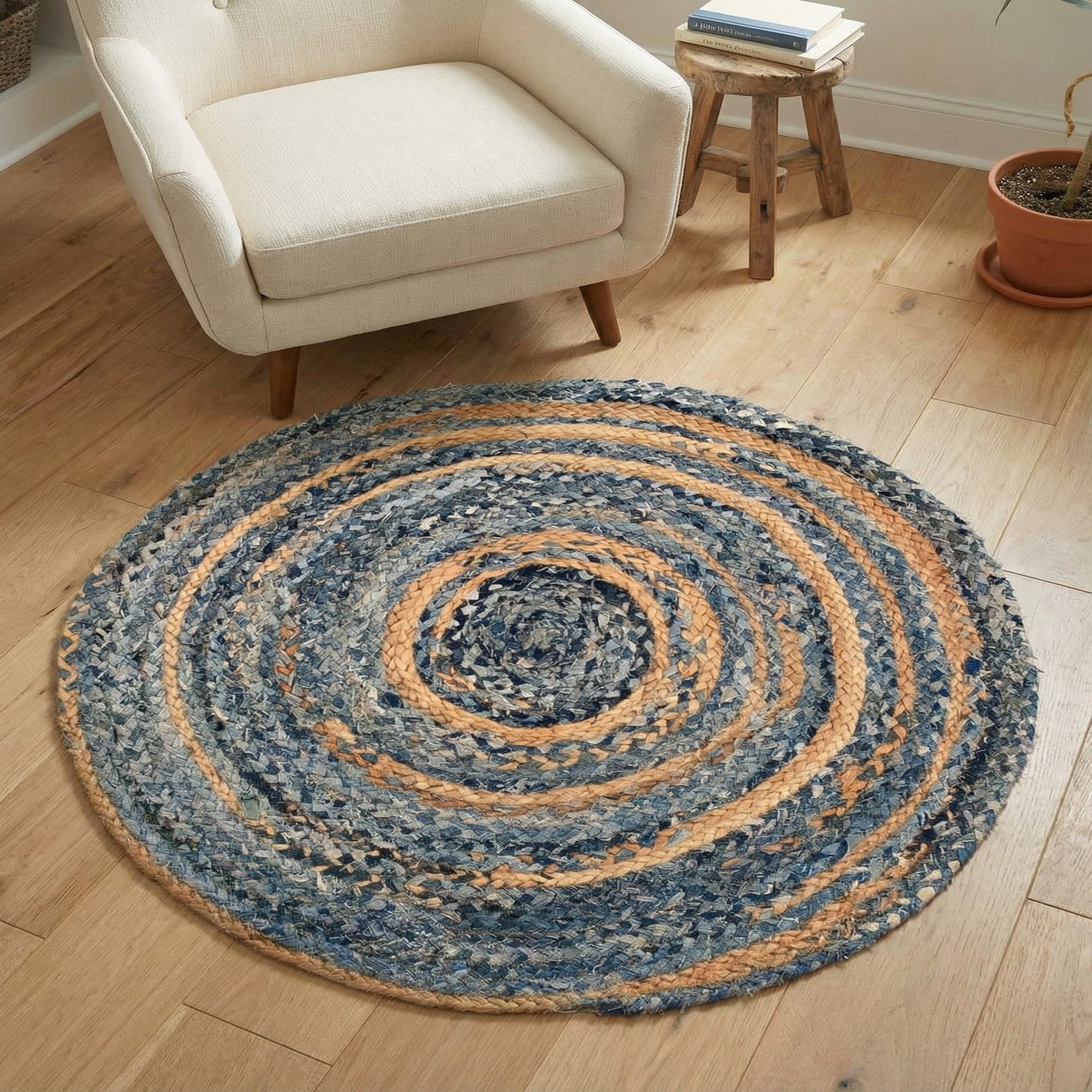 Hand-braided from 60% denim cotton and 40% jute, this round rug shows concentric braided rings that alternate weathered denim blues with warm natural tones. The background color is Blue and Natural, with variegated indigo, faded chambray and sandy tan strands woven together to create subtle contrast and depth. Run your hand across the surface and you'll notice the interplay of soft, worn cotton and firmer jute—a textured, low-profile weave that feels substantial underfoot without being lofty.