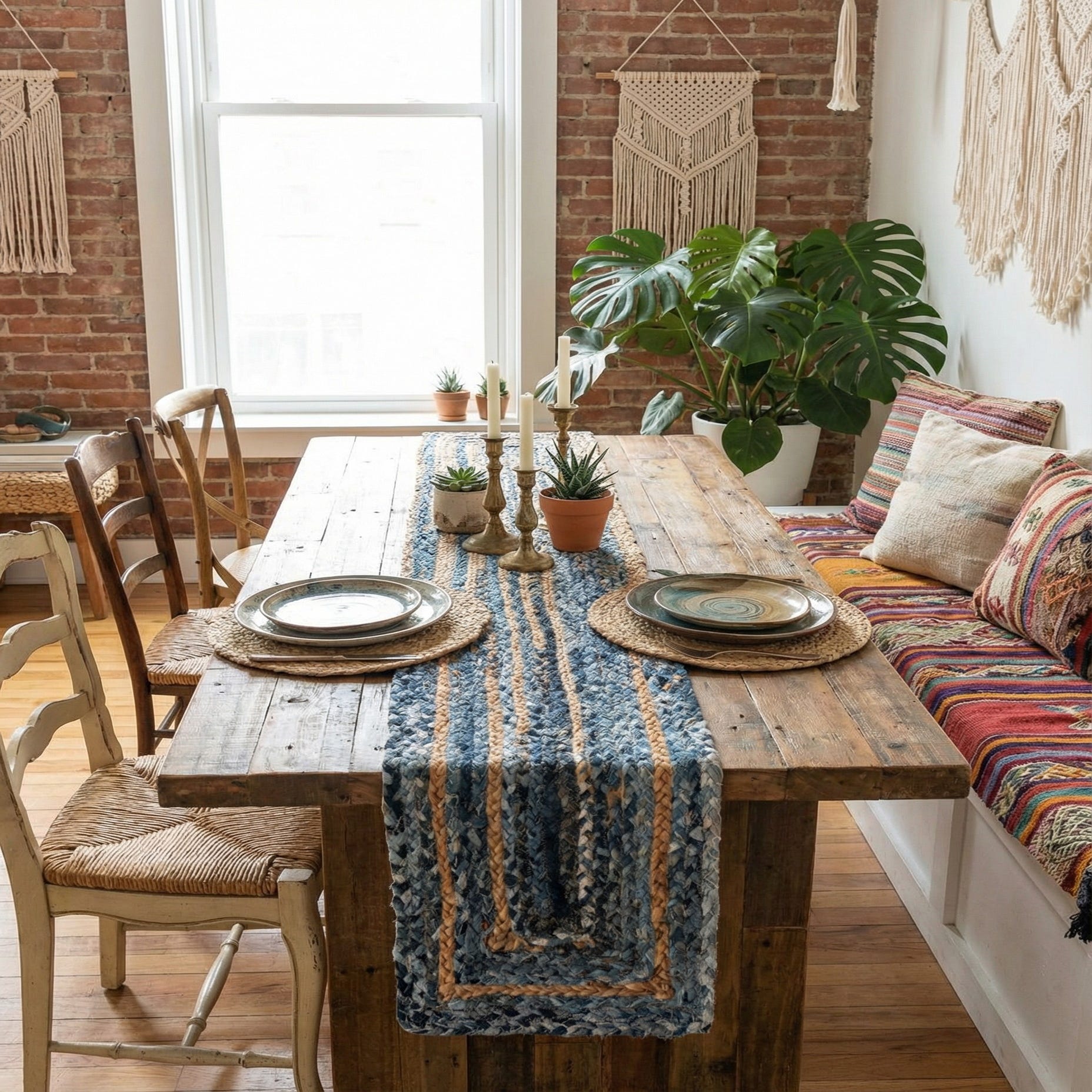 Place this runner on a farmhouse or reclaimed-wood dining table, a narrow console, or an entry table to introduce casual texture and muted color. It pairs well with whitewashed or light oak finishes, linen napery, wicker baskets, and leather or brass accents, fitting easily into coastal, cottage, rustic, or relaxed modern interiors. Use it to ground a vignette on a sideboard, layer it on a larger natural-fiber rug, or let it bring a subtle denim accent to a kitchen island.