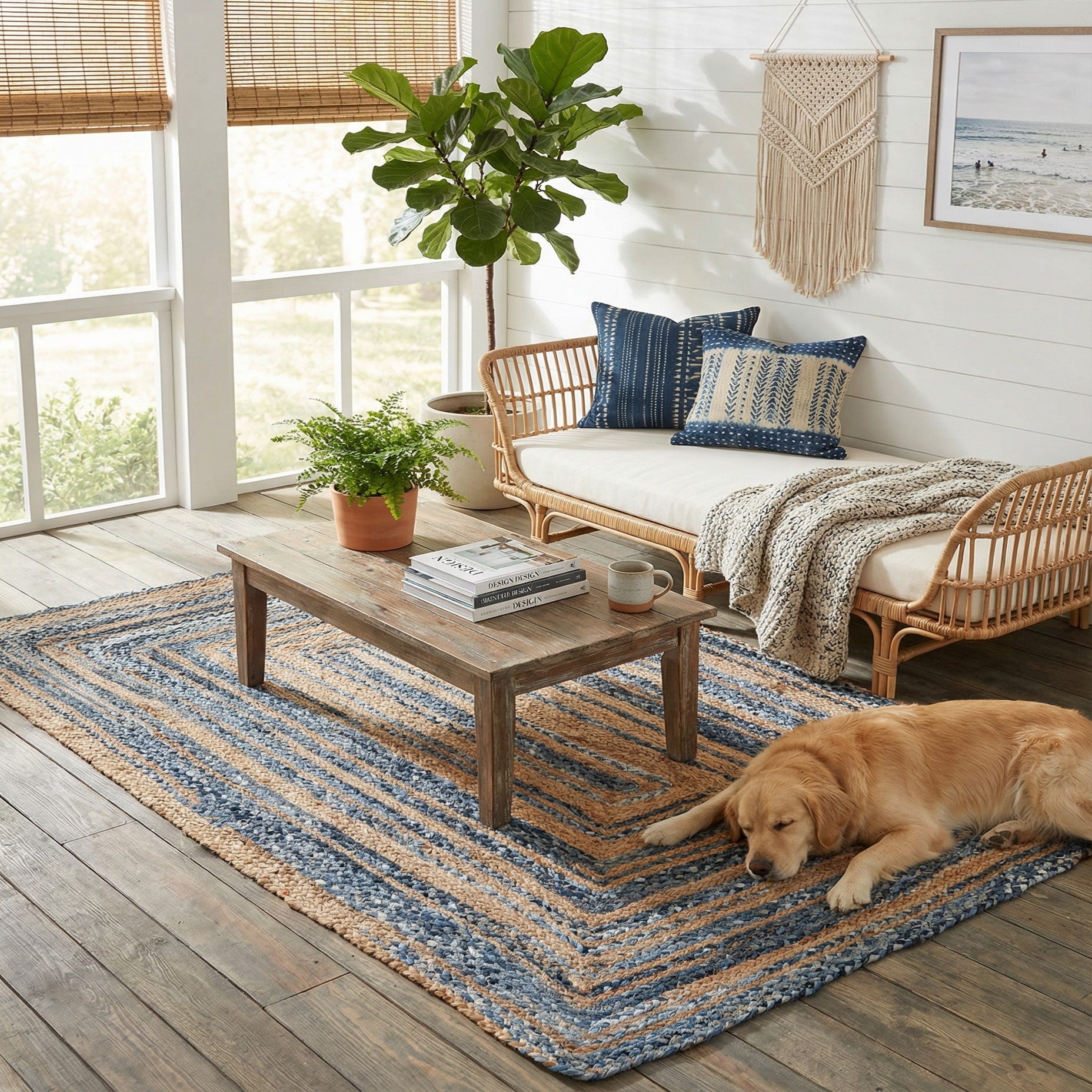 The braided construction gives the surface a low-profile, tactile texture: the jute adds firm structure while the denim cotton feels softer to the touch, so the rug has a grounded yet approachable hand underfoot. It works well in relaxed coastal, farmhouse, or cottage-style interiors and pairs nicely with wood furniture, neutral upholstery, or navy accents. Place it in an entryway or kitchen for everyday durability, layer it under a small dining table or bedside to add visual warmth, or use it in a casual living room to anchor seating without overpowering the space.