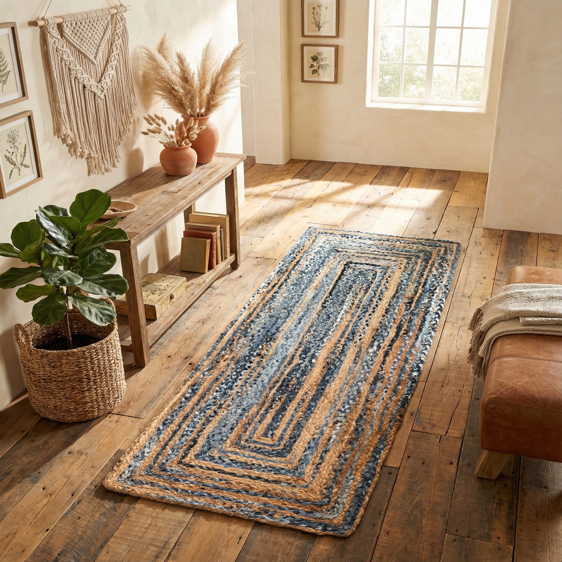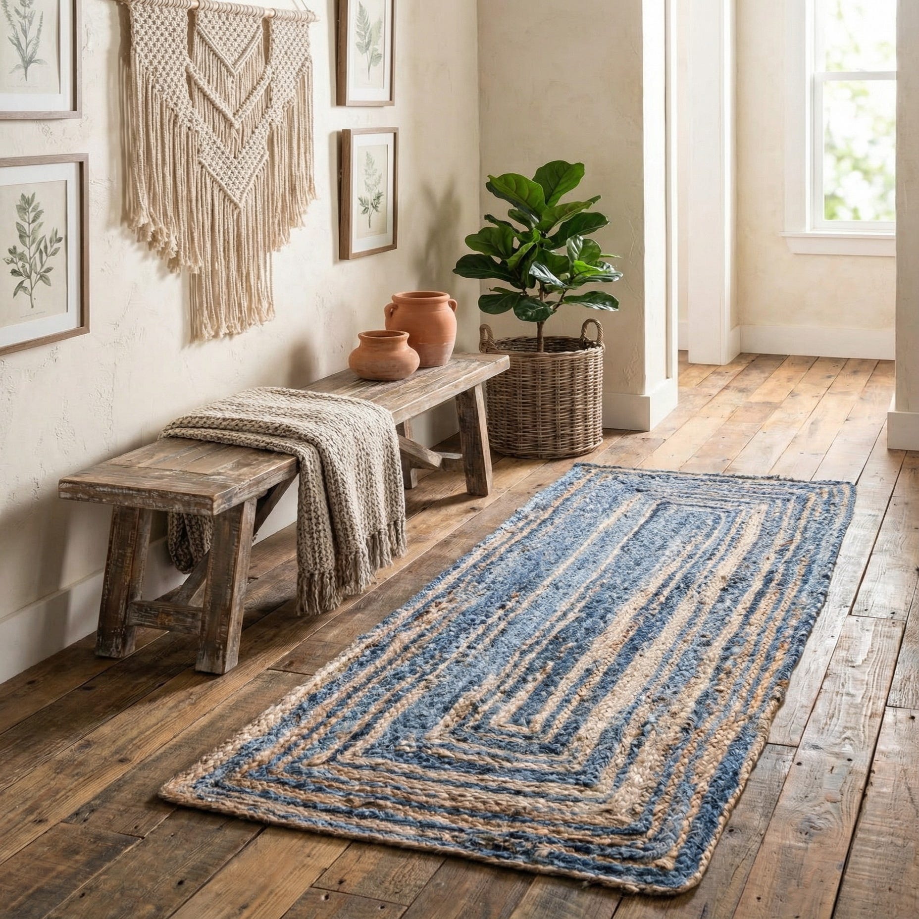 Made of 60% denim cotton and 40% jute, the surface combines the soft, worn texture of cotton with the firmer, earthy bite of jute for a tactile, slightly textured underfoot. This runner works well in entryways and narrow hallways where the pattern can lead movement through a space, and it pairs naturally with reclaimed wood floors, painted cabinetry, or denim and leather accents. It also suits coastal, cottage, and casual farmhouse interiors, or layered over a larger area rug to add color and texture.
