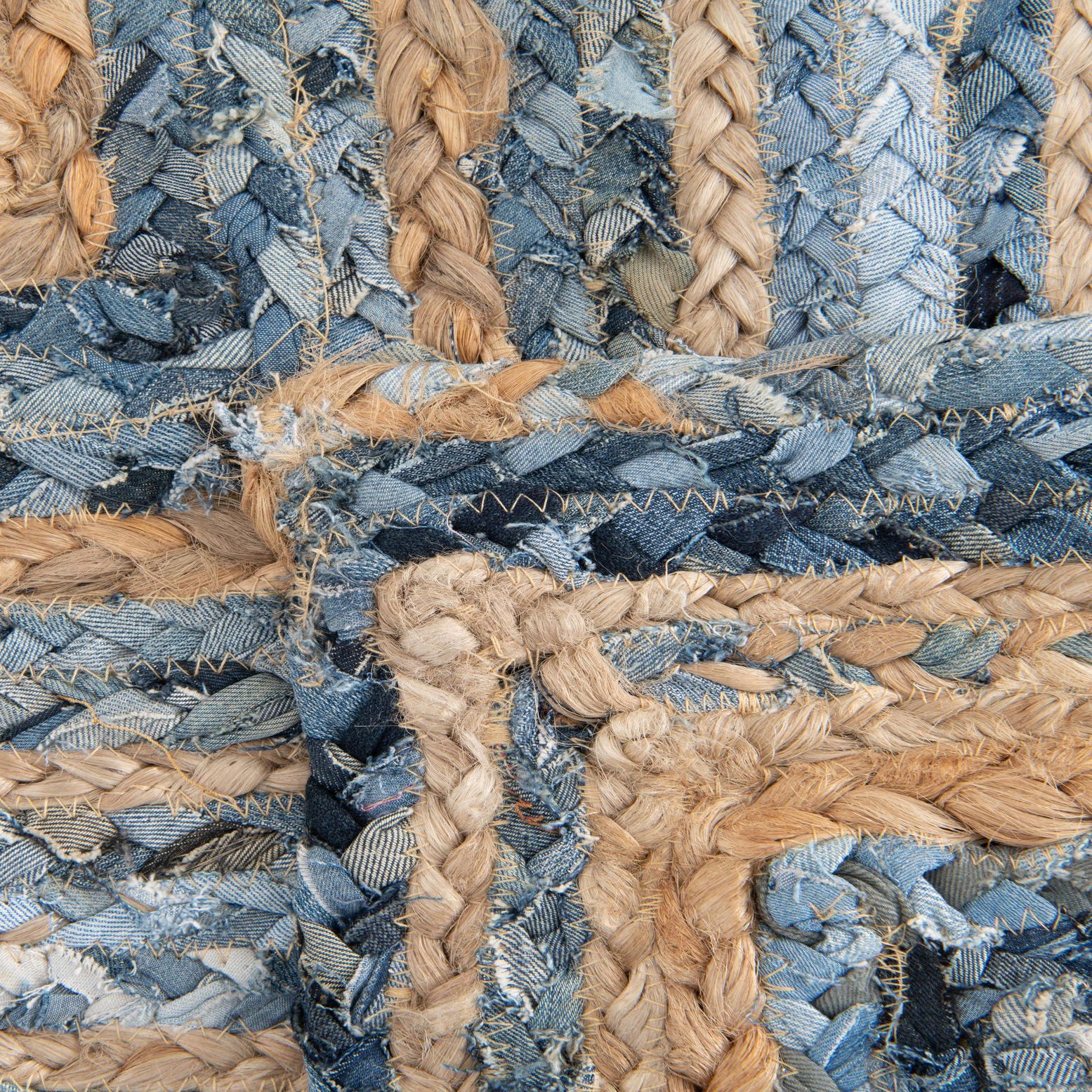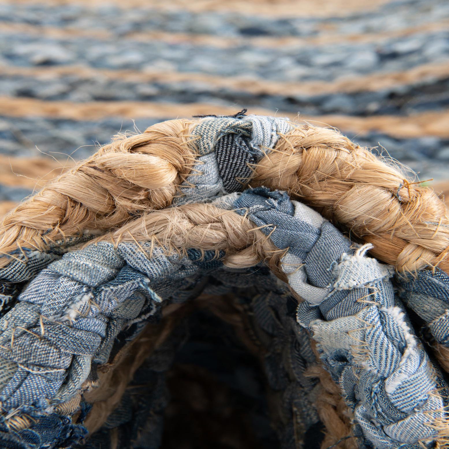 A 6 ft runner rug with a braided chindi pattern in shades of blue denim and natural jute, creating a textured, eclectic stripe design.