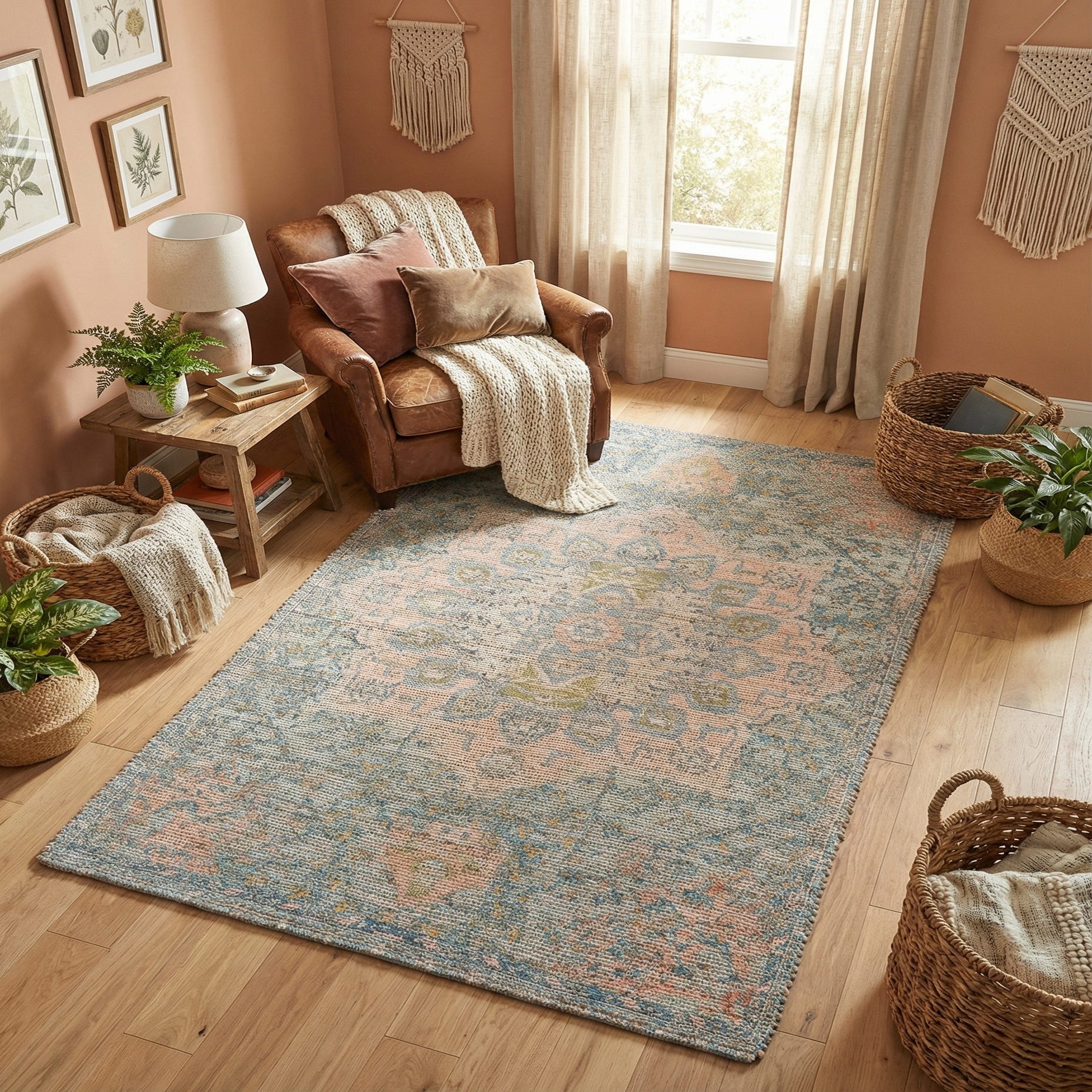 A soft central medallion and scrolling floral motifs float across a blue-and-peach background, with ivory, light blue, natural, green and gold accents tracing the pattern. The design has a softly distressed finish that lets the colors blend together for a lived-in, layered appearance, while a narrow border frames the composition and keeps the layout balanced. The palette reads gentle and versatile, with peach warmth balanced by cool blue tones and small pops of gold and green for visual interest.