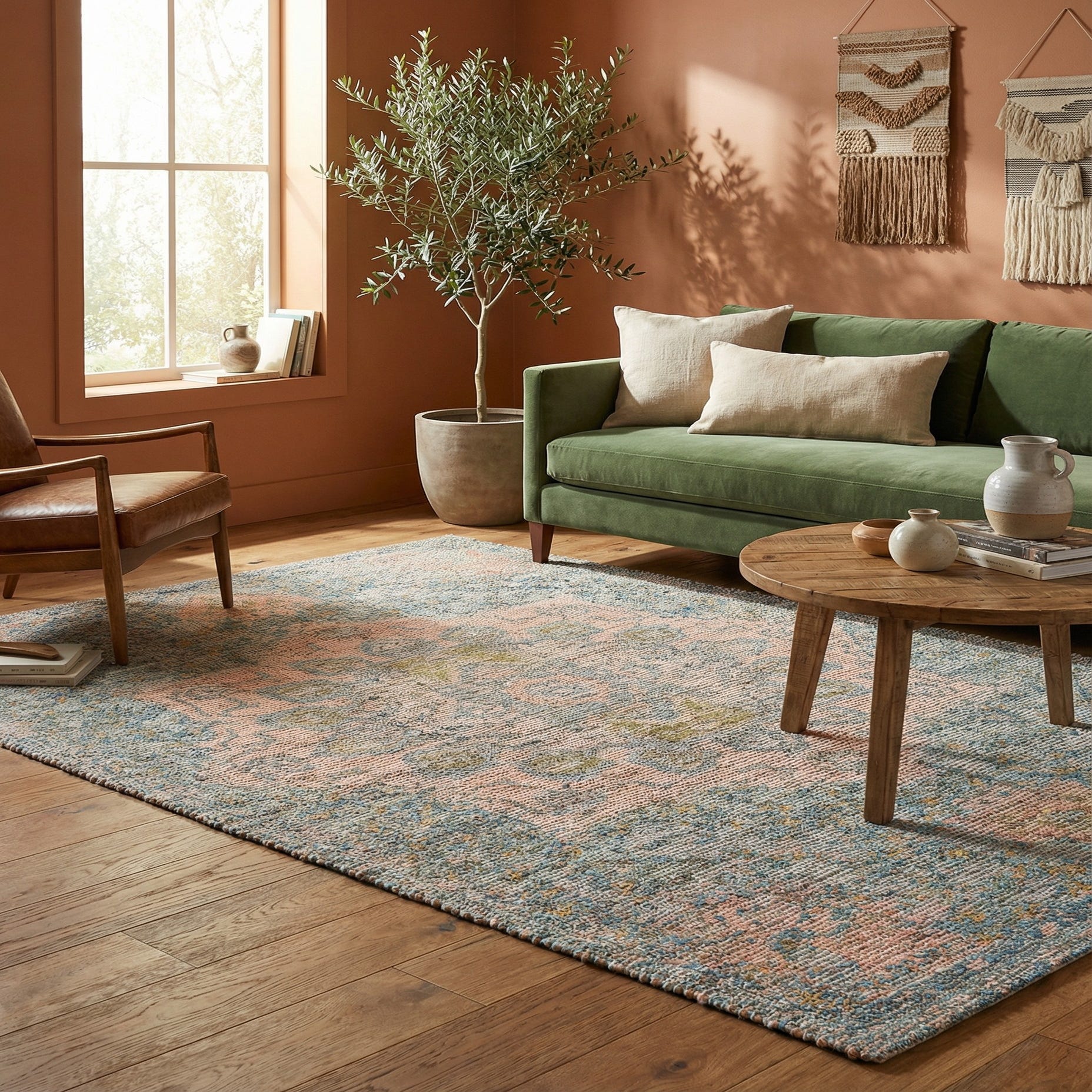 Hand-woven of polyester chenille and jute, the weave combines the chenille’s soft, slightly plush threads with the natural slub and texture of jute for a low-profile, tactile feel underfoot. Use it to anchor a relaxed living room seating area, beneath a dining table with light wood chairs, or layered in a sunlit bedroom for added depth. It pairs well with linen upholstery, rattan or woven accents, painted millwork, and warm oak tones, and fits comfortably into coastal, cottage, transitional, or casual-modern interiors.