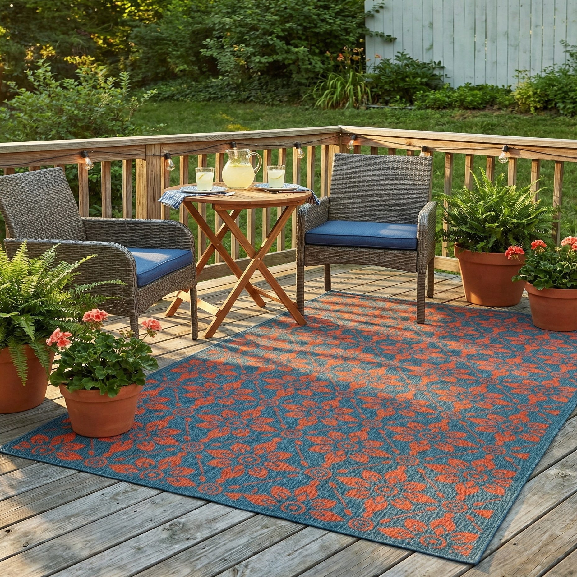 A 5x8 rectangular indoor/outdoor rug featuring a repeating modern floral pattern in vibrant red-orange against a deep blue background.