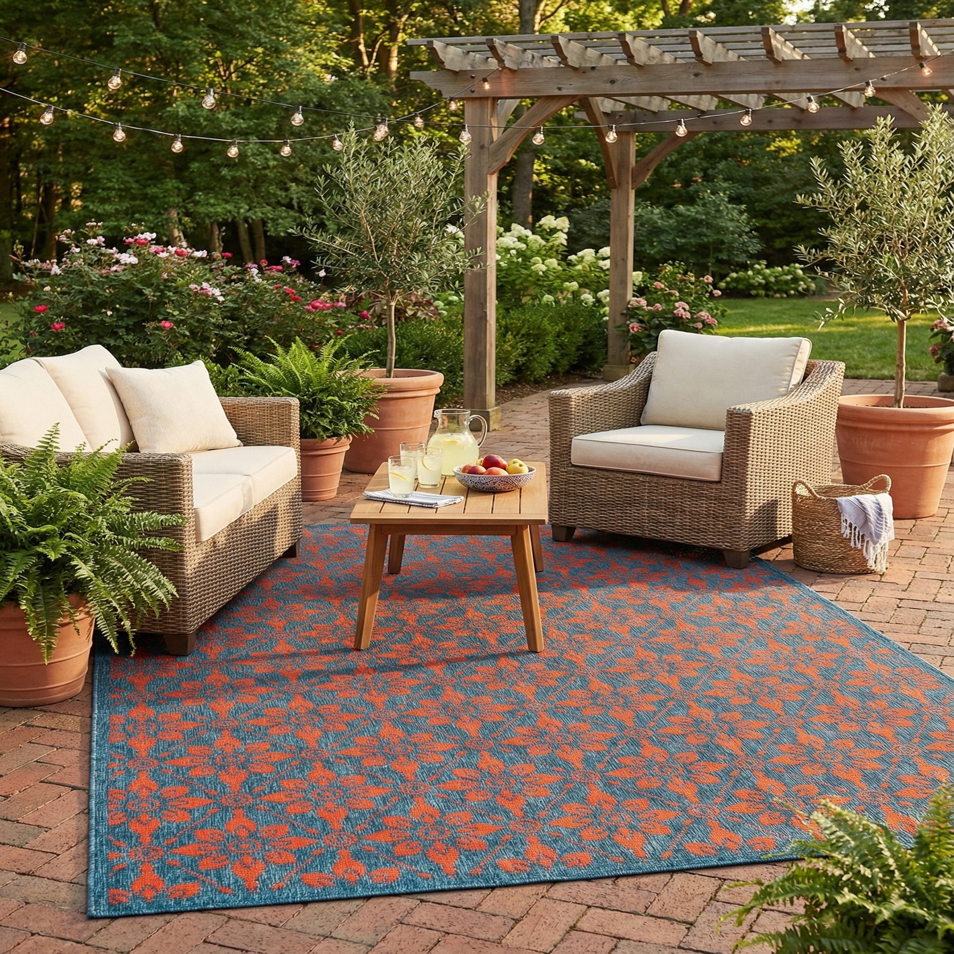 A striking lattice of floral medallions in vivid red sits against a deep blue ground, forming a rhythmic, tile-like pattern that blends traditional motifs with a contemporary colorway. Machine-made of 100% polypropylene, the rug has a low-profile, tightly woven surface with a firm, slightly textured hand that lays flat and feels substantial underfoot. The repeat pattern and clear color contrast give the piece a tailored look that reads fresh and intentional in both indoor and outdoor settings.