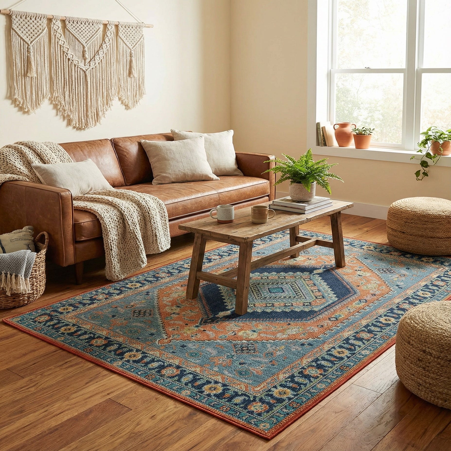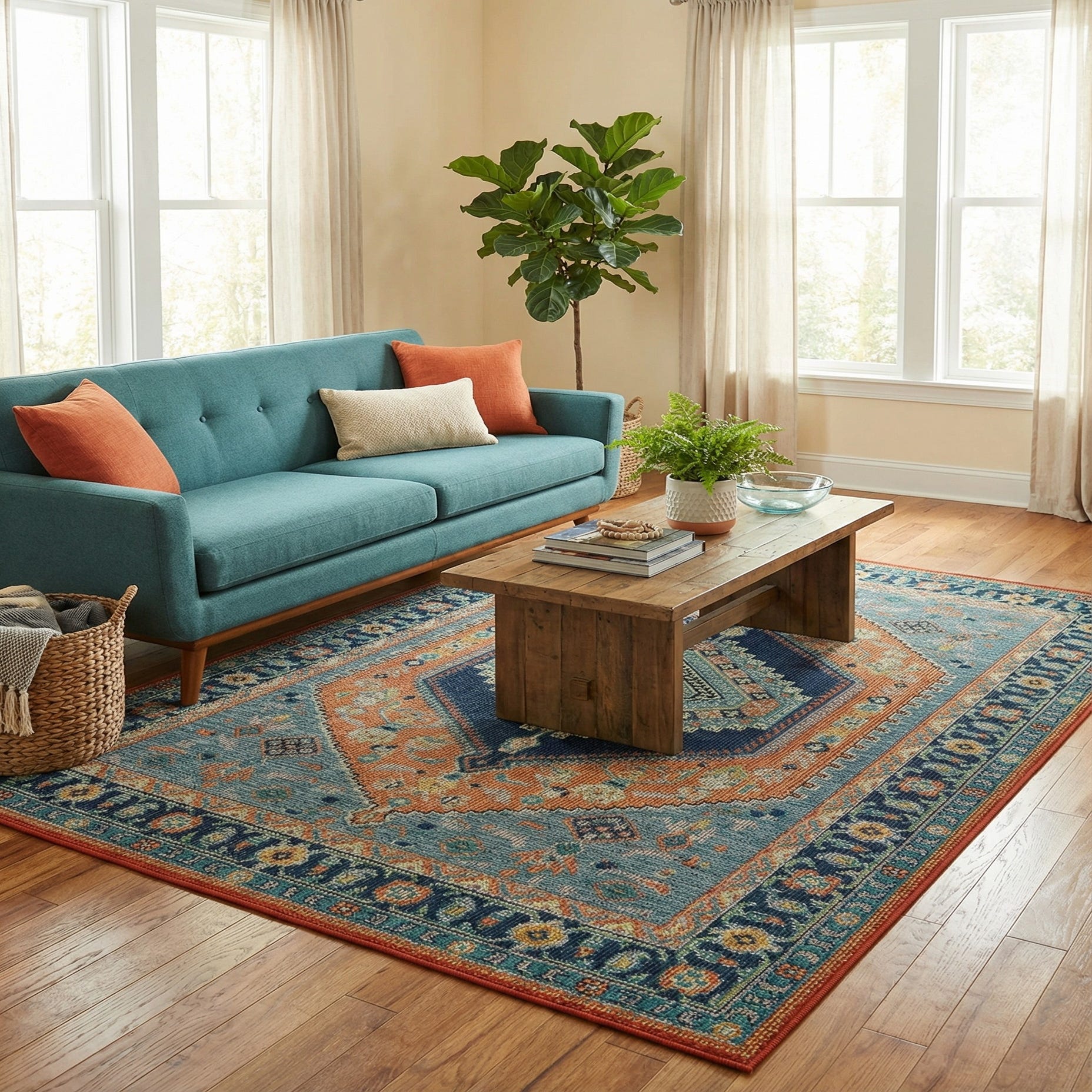 A 5x8 rectangular Baja Outdoor rug in blue and rust red with a traditional medallion pattern, ideal for indoor or outdoor spaces.