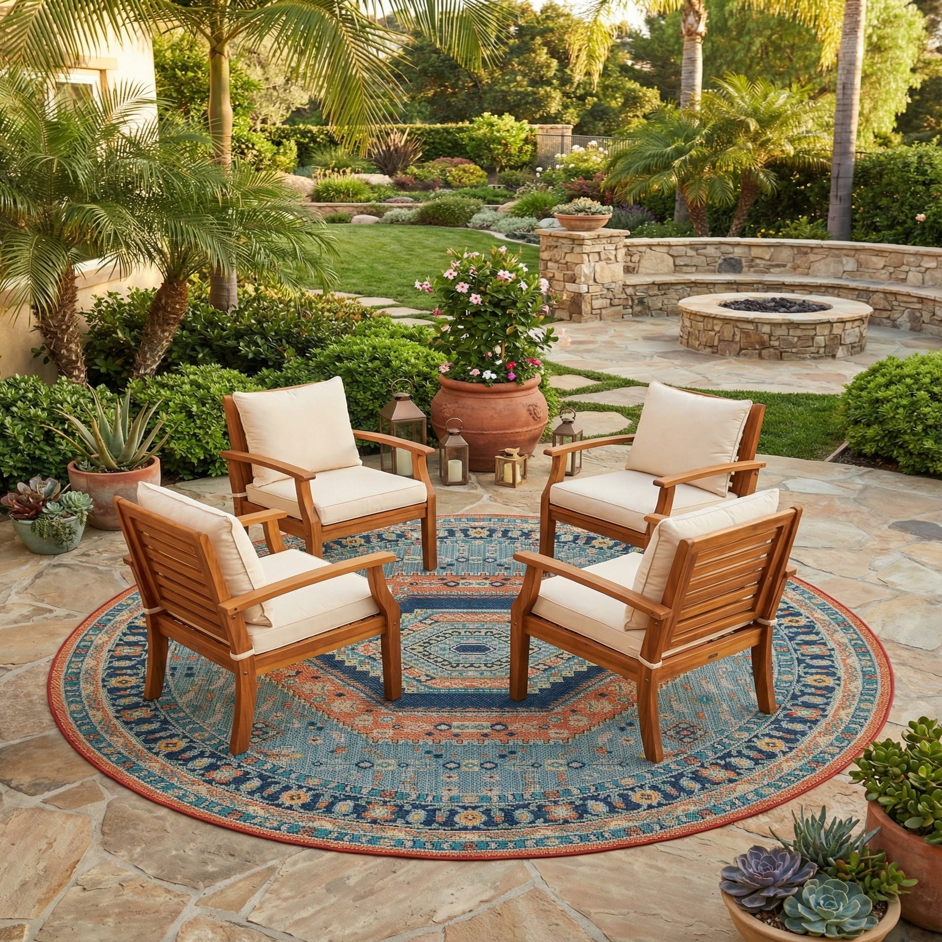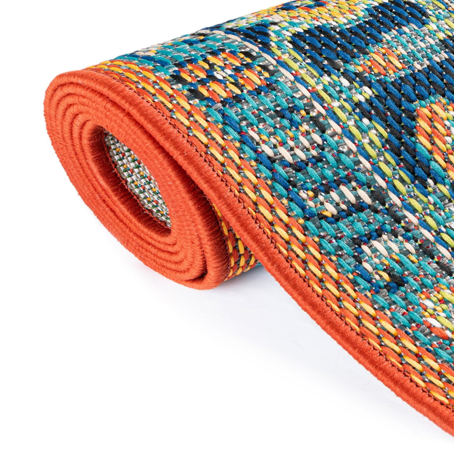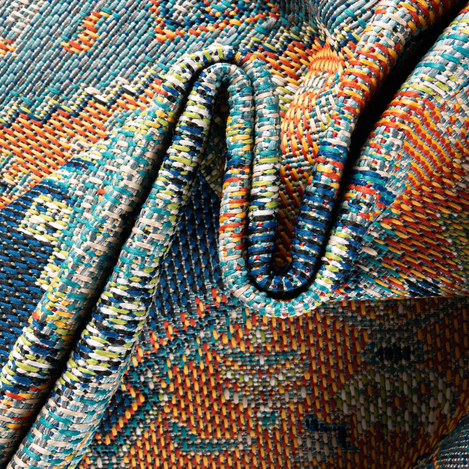 Machine made from 100% polypropylene, the rug has a low-profile, tightly woven texture that feels firm underfoot and holds its pattern detail. Its color story — blue and rust-red background with navy, ivory and yellow accents — pairs naturally with weathered wood seating, rust-leather or navy outdoor cushions, and woven textures. Ideal for a covered patio or sunroom, it also works as an anchor for a casual dining nook, a round bistro set, or an entry area where you want a mix of color and structured pattern.