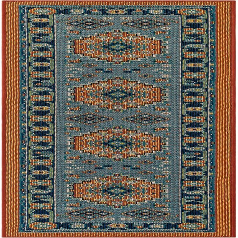 A classic medallion runner with a geometric border, this piece pairs traditional motif structure with a lively color story. The field rests on a blue and rust red background, punctuated by stepped medallions in rust, orange, ivory and touches of black and green, while yellow highlights and small diamond motifs add visual interest. Machine made of 100% polypropylene, the rug has a low, tightly woven surface with a firm, slightly textured hand that reads like a durable outdoor weave.